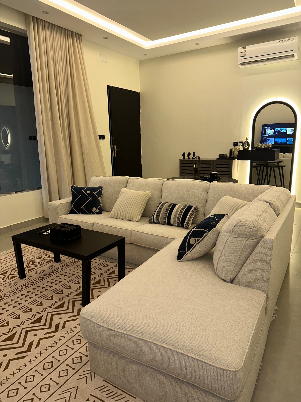 Un apartamento elegante y tranquilo, equipado con una red de Internet rápida, que consta de un amplio salón y dormitorio, y una esquina de café, con acceso completo y privacidad. Tiene una entrada privada, cerca de todos los servicios. A 15 minutos del aeropuerto, a 5 minutos del centro comercial Asir, a 3 minutos del hospital de maternidad y a 8 minutos del parque infantil.