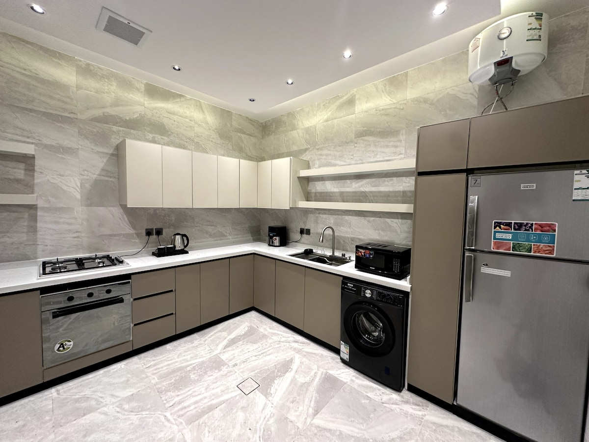 Un apartamento cerca del Aeropuerto Internacional de Abha (a 4 minutos) con un diseño lujoso y espacios amplios. Consta de un dormitorio, una sala de estar, una sesión al aire libre y un baño. Acceso inteligente y entretenimiento (Suscripción a Shahid y Netflix – consola de videojuegos) Además del rincón del café y la preparación Destaca su proximidad a los principales lugares: - Proyecto de barco de entretenimiento (min) - Paseo Al Rawdah y parque del aeropuerto (min). - Lee Premiere (3 minutos) - Calle Al Mih (a 5 minutos). - Abha Yard (a 7 minutos). - Lavinda Park (a 7 minutos). Al Rashed Mall (a 11 minutos). Feliz estadía
