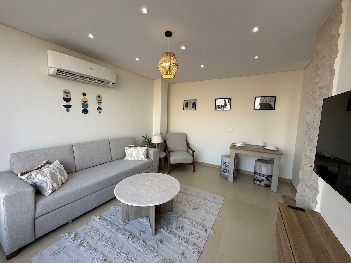Descubre nuestra joya de 1 dormitorio en el complejo Golden Gates, a 5 minutos de Maadi, a 10 minutos de la nueva ciudad de El Cairo y Nasr, a 15 minutos del aeropuerto de El Cairo y Heliópolis. Cocina americana totalmente equipada, una elegante mezcla de ambientes modernos y bohemios. Disfruta de una vista al jardín, seguridad las 24 horas, los 7 días de la semana y servicios en el lugar como cafeterías, restaurantes, el hipermercado Carrefour e incluso un hospital. Relájate con un televisor inteligente de 65 pulgadas, con servicios de streaming, y mantente conectado con wifi rápido. ¡Tu aventura en El Cairo comienza aquí!