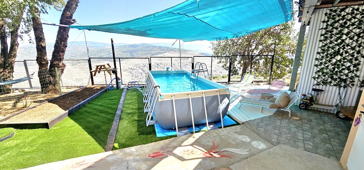 Alquiler vacacional privado en Gilon: tranquilo, espectacular vista a la montaña y una verdadera sensación de libertad. 2 dormitorios (en la habitación 1 cama doble y en la otra habitación 2 camas individuales, una cama de transición y colchones), un espacio protegido compartido. cocina totalmente equipada, Jardín privado con piscina cubierta 4×2, climatizada a 36 grados. Equipado con parrilla, estacionamiento adyacente e internet. Adecuado para familias o parejas de hasta 7 huéspedes. Impresionante sendero para caminar cerca, tienda de comestibles y carrito de café en Shabat (tratamientos de belleza, masajes, talleres). Ubicación perfecta para viajes: Acre, Rosh HaNikra, el Mar de Galilea y más. Puedes pedir Jachnun con un huevo, arroz picante (30 NIS por unidad) o un kebab y salsas (100 NIS).