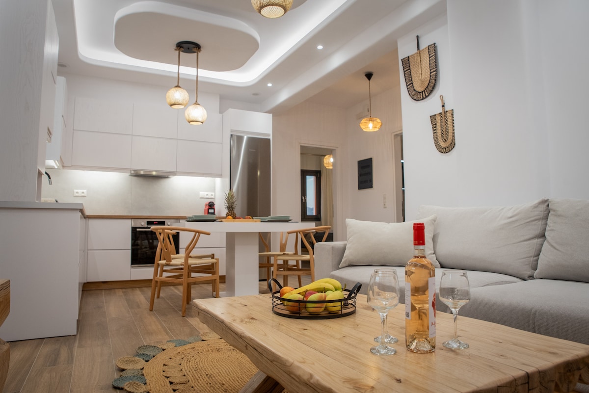 Un apartamento de estética única con un hermoso patio privado y muchos toques artísticos, ubicado en un pintoresco barrio en el corazón de la ciudad de Naxos que puede alojar hasta 5 huéspedes. Situado a 10 minutos a pie del puerto, a 1-2 minutos del mercado y de otros lugares de interés (castillo, museos, etc.) y de entretenimiento (bares, restaurantes, etc.). Si viajas sin coche, no te preocupes; la estación de autobuses más cercana a las playas y pueblos más populares está a 3 minutos a pie. ¡Plaza de aparcamiento gratuita a 3 minutos a pie!
