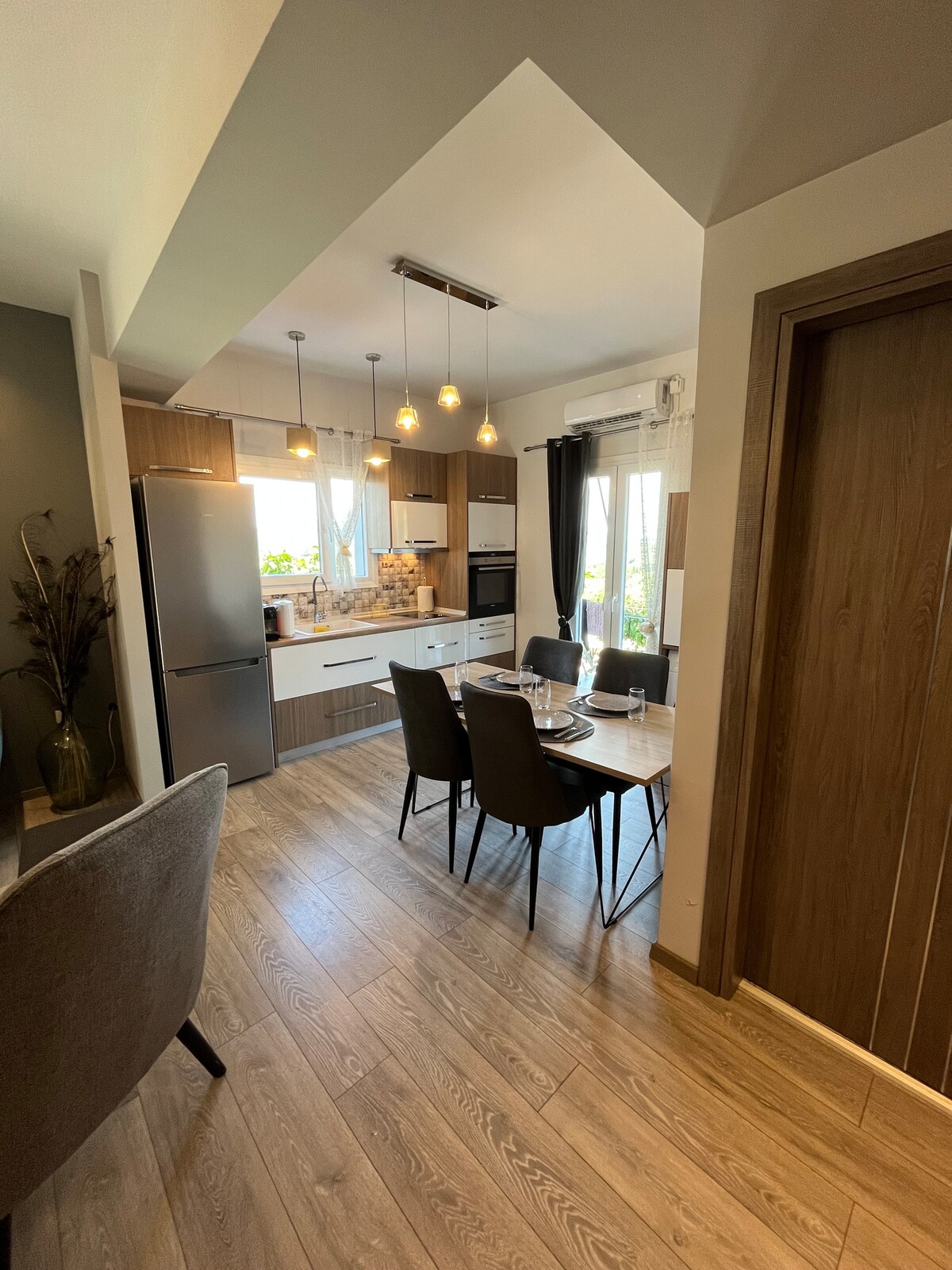 Un apartamento de dos dormitorios con una cocina totalmente equipada, un amplio salón y comedor, una ducha a ras de suelo y su propio estacionamiento y jardín. El centro de este gran pueblo está a pocos pasos y tiene muchas tabernas, cafeterías y bares para elegir, así como supermercados y panaderías. El pueblo está situado en la ladera de una montaña con hermosos senderos. Alrededor de la zona y a pocos kilómetros en auto hay numerosas playas hermosas.
