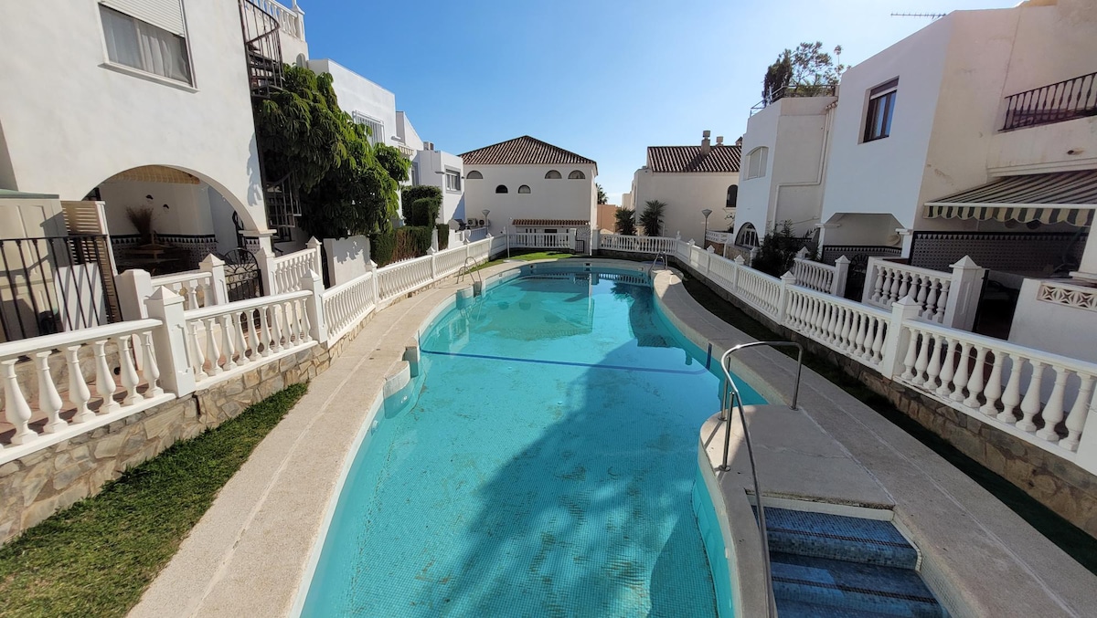 Acogedora casa, ideal para familias con hijos, a 10 minutos de la playa para aquellos que buscan descanso en sus vacaciones. Se encuentra en zona tranquila de Aguadulce. La casa cuenta un amplio salón, cocina totalmente equipada, 3 dormitorios, dos baños y una terraza donde disfrutar de la cena con vistas panorámicas al parque. La casa ofrece dos piscinas comunitarias, una de ellas específica para niños pequeños. Asimismo, existe aparcamientos alrededor de la comunidad.