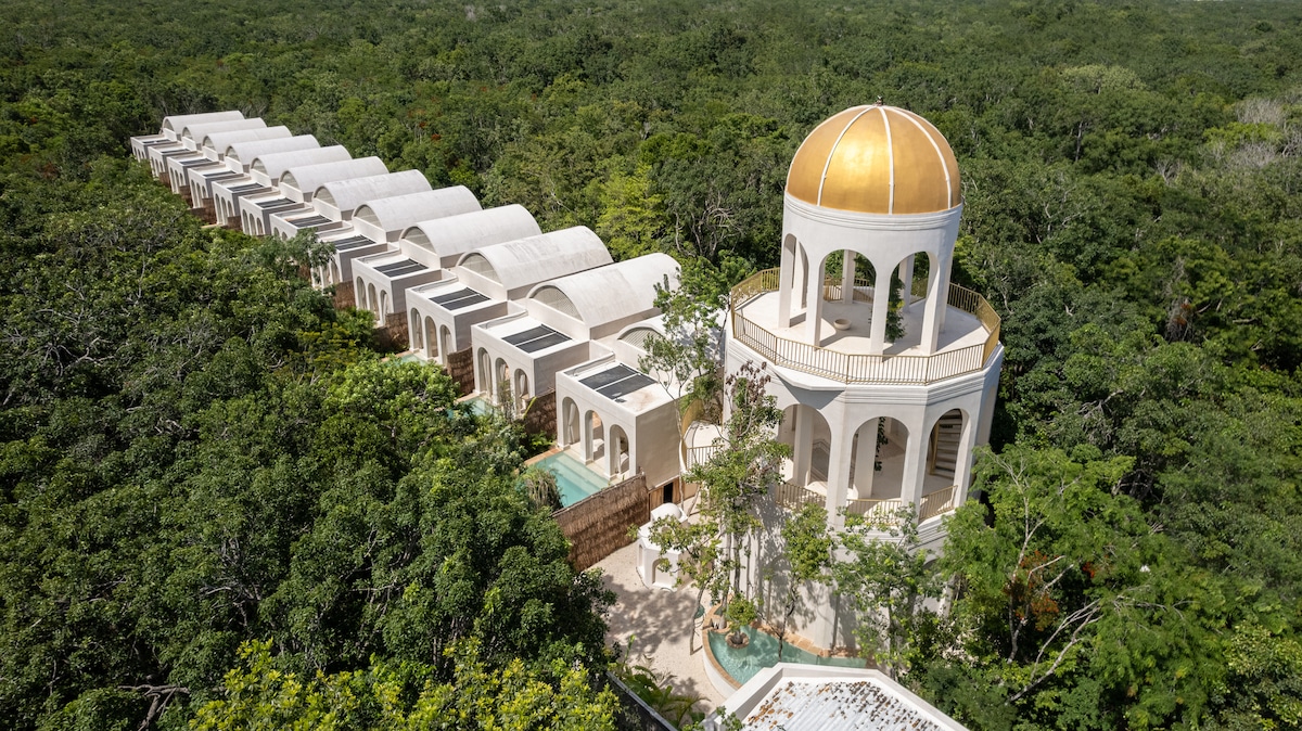No availability? Other treehouses on Host Profile. Enjoy this unique Jungle Treehouse Experience in the tree tops. The Canopy treehouse is intentionally elevated (height: 6 Mts/20ft) and shaped amongst the trees. A spacious Eco dome gives you all the comfort of Glamping: King bed, private bathroom & HIGH SPEED fan. Relax in nature, swing the hammock enjoying the views or gaze at the stars. The property is located 10-15 MIN DRIVE from different beaches of Tulum & a short stroll to nearby cenotes.