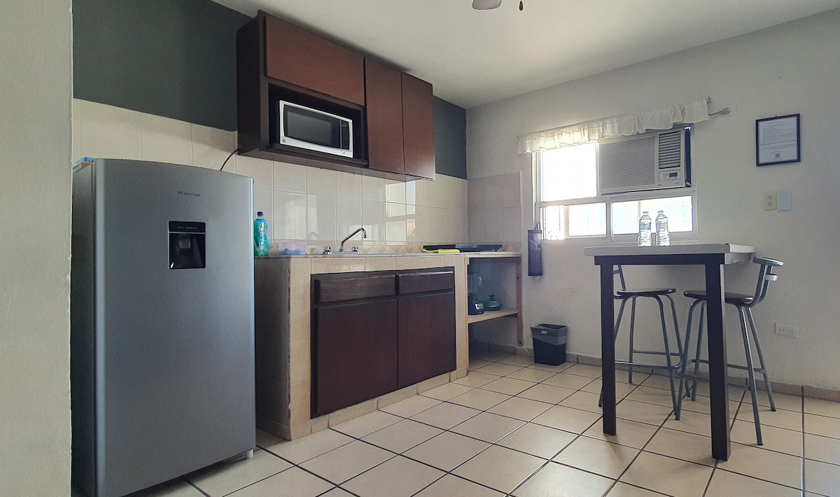 Nuevo departamento, moderno y práctico ubicado en el fraccionamiento las fuentes, a unos pasos de la ciudad deportiva Aurelio Rodríguez Y estadio de béisbol Emilio Ibarra Almada, nuestro departamento cuenta con : -Cama Queen size -A/C minisplit -Plancha -Internet 1000 Mgb -smart tv 50” -Regadera Eléctrica -Refrigerador -Estufa -Puerta de seguridad -Licuadora -Cafetera -Utensilios -Dispensador -Tinaco y bomba de agua -Cocina integral -Closet -Comedor -Estacionamiento -cámaras de seguridad