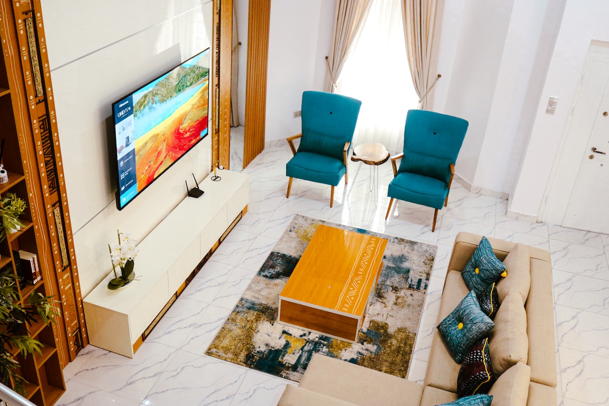 3 KING SIZE BED and 1 DOUBLE BED, stylishly furnished 4 bedroom DUPLEX with SELF COMPOUND with 2 LIVING ROOM with Jacuzzi, centrally located in the upscale neighbourhood of Osapa London in Lekki, Lagos. 24 hours power supply, for a long term Family stay, WATCH NETFLIX, DSTV, 6 mins drive to the beach lined with assortments of restaurants, clubs and lounges with variety of local foods and Super Market. Spas and massage parlour are in close proximity, 10 mins to Lekki Conservation Centre.