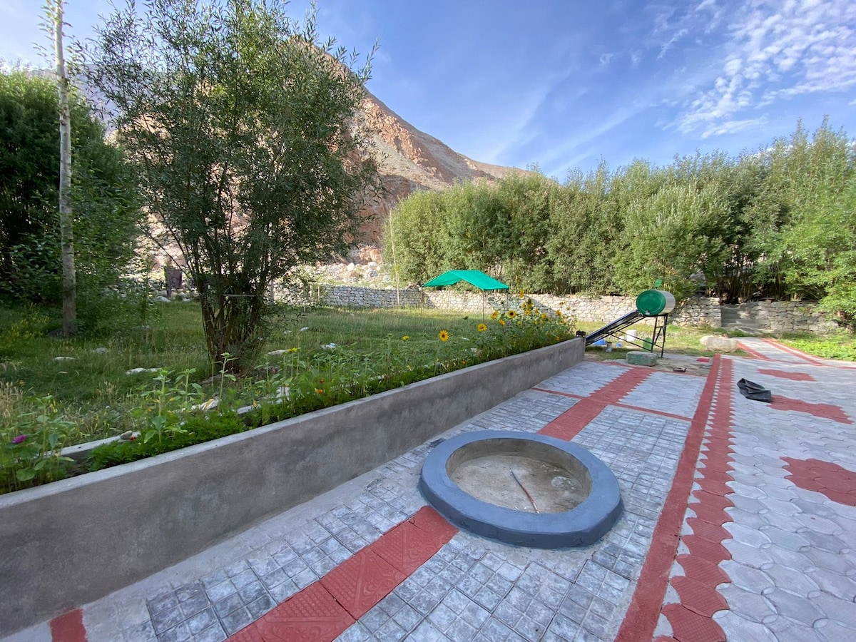 Nuestra casa artesanal es una casa privada situada en el pueblo de Choglamsar, un barrio residencial tranquilo de Leh con mucha vegetación. Estamos lejos del bullicio de Leh, pero aún así muy cerca, a 7 km de Leh. Comenzamos a construir esta casa en 2019 con la idea de crear un espacio que se sienta parte de la tierra sobre la que está construido y en armonía con el ecosistema de Ladakh. Nos encanta cocinar para nuestros huéspedes, por lo que la cena y el desayuno están incluidos si lo deseas.