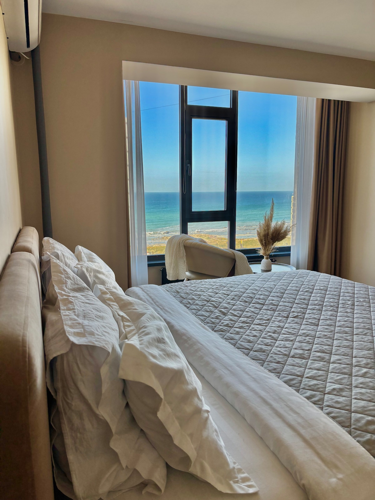 departamento renovado de diseño con vistas al mar en el centro de la ciudad. El apartamento cuenta con todo lo que necesitas para una estancia cómoda y relajación. Dormitorio con vista al mar, elegante y cómoda cama tamaño king. La ubicación está en el centro de la ciudad junto al mar, en la casa en las plantas inferiores hay cafeterías, restaurante Mint, supermercado Dana, panadería Bulka y más. Cerca hay centros comerciales, tiendas, farmacias, restaurantes, parque de entretenimiento, terraplén. La casa no es un edificio nuevo. Hay un depósito de 10,000 tenge