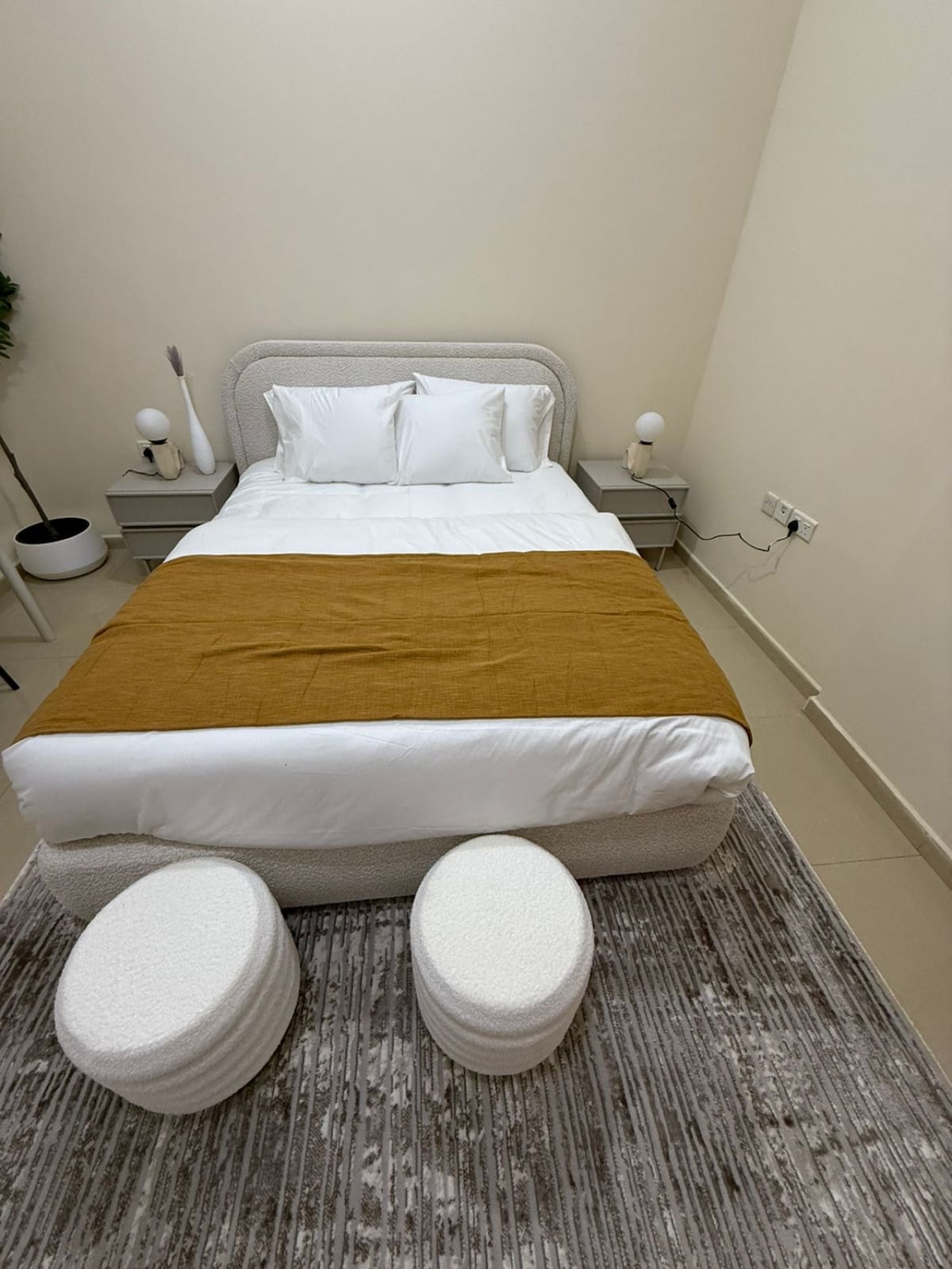 A large, fully furnished 2-bedroom apartment in central Al Ain. Suitable for short or long stays and close to shops, restaurants, cafés, and malls. The unit includes a living room, two bathrooms, and a fully equipped kitchen with a fridge, stove, and washing machine. Each room has AC and the living area has a 65-inch smart TV. Guests can access the gym in the same building with daily or monthly membership. Clean, quiet, convenient for families and visitors, with easy check-in and fast support.
