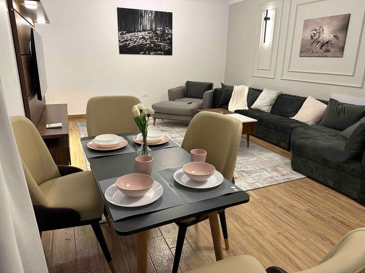 ¡Te damos la bienvenida a nuestro Deluxe de 2 dormitorios en Golden Gates Compound! A solo 5 minutos de Maadi, a 10 minutos de New Cairo y la ciudad de Nasr, y a 15 minutos del aeropuerto de El Cairo y Heliópolis. Disfruta de una cocina totalmente equipada, una elegante decoración moderna de boho, seguridad 24/7 y servicios en el lugar como cafeterías, restaurantes, Carrefour y un hospital. Relájate con un televisor inteligente de 65 pulgadas y wifi de alta velocidad. Tu aventura en El Cairo comienza aquí. ¡No podemos esperar para hospedarte!
