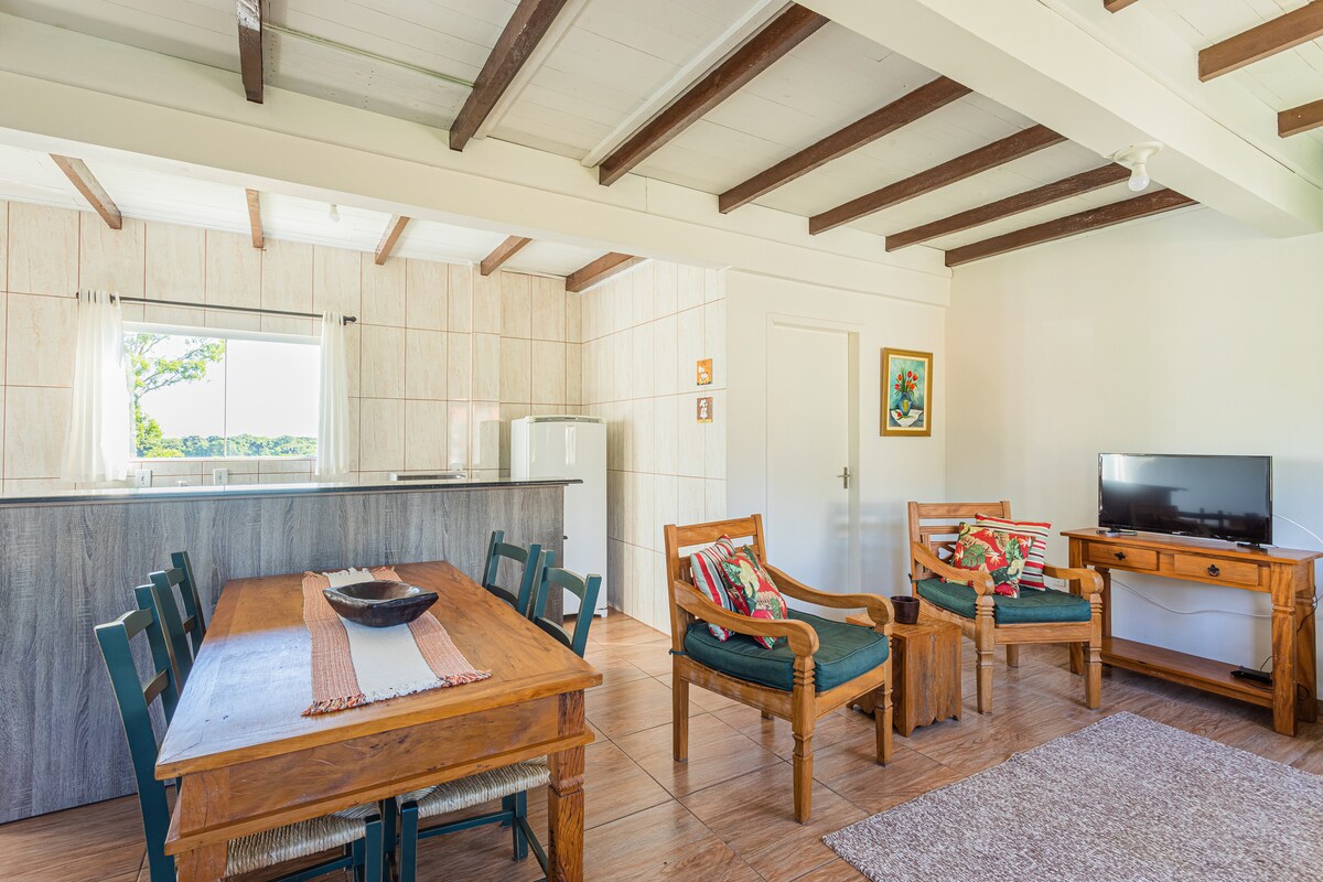 Bienvenido a Cantinho da Oma, una casa rústica y acogedora en el corazón de Carambeí. Con paredes de ladrillo a la vista, muebles antiguos y un ambiente tranquilo, esta casa combina sencillez, comodidad y encanto. 🌿 Es ideal para relajarse o explorar lo mejor de Carambeí. Está cerca del Parque Histórico, Frederica's, Frisia y una de las pizzerías más queridas de la ciudad. ✨ La propiedad tiene Wi-Fi, estacionamiento privado en los terrenos y acepta mascotas.