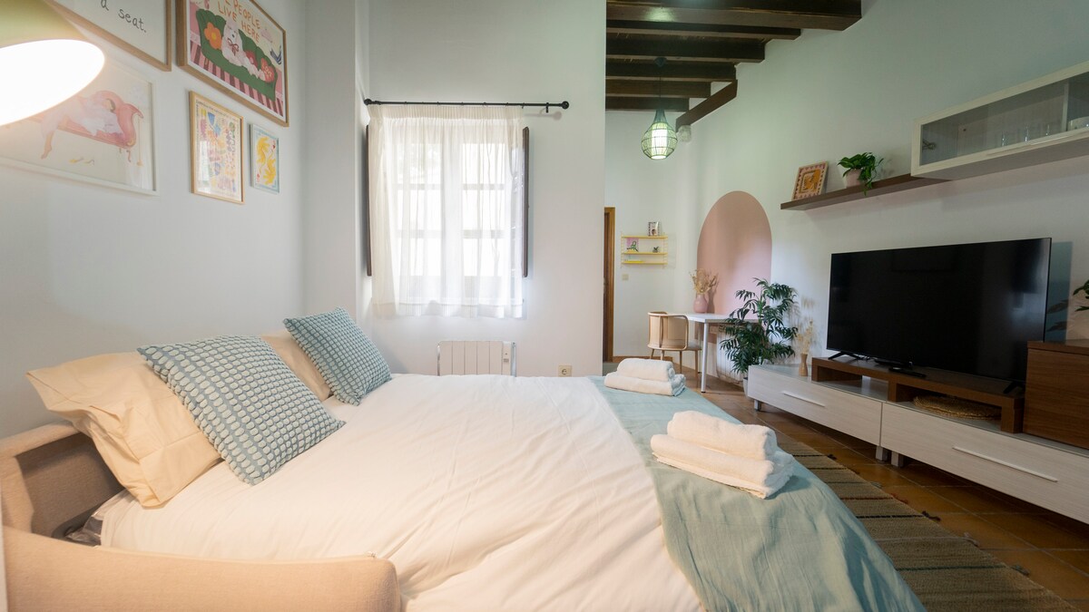 Acogedor apartamento recién reformado y con excelente ubicación. Se encuentra en el Albaicín bajo, la zona más céntrica del barrio más emblemático de Granada, declarado Patrimonio de la Humanidad y a 8-10 min andando de las principales actividades turísticas de la ciudad. Además se incluye PARKING GRATUITO durante toda la estancia a tan solo 7-8 minutos andando del apartamento. Ideal para parejas o familias y grupos de hasta 4 personas. Adaptado para bebés y teletrabajo.
