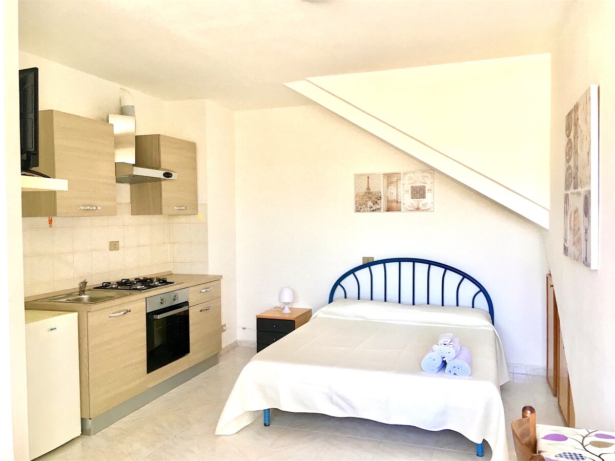 Precioso estudio independiente, acogedor, con entrada libre y piscina gratuita (AGUA SALADA, SIN CLORO) ¡prácticamente con agua de mar! Completo con todo... cama doble, baño espacioso, TV led vía satélite, aire acondicionado, calefacción, cocina completa, horno clásico, microondas, nevera, lavadora y aparcamiento... ¡incluso un pequeño armario para maletas! ¡Ideal para un poco de relax, paz y silencio nocturno! ¡Tiene capacidad para 2 personas y una tercera si es un niño en CUNA!