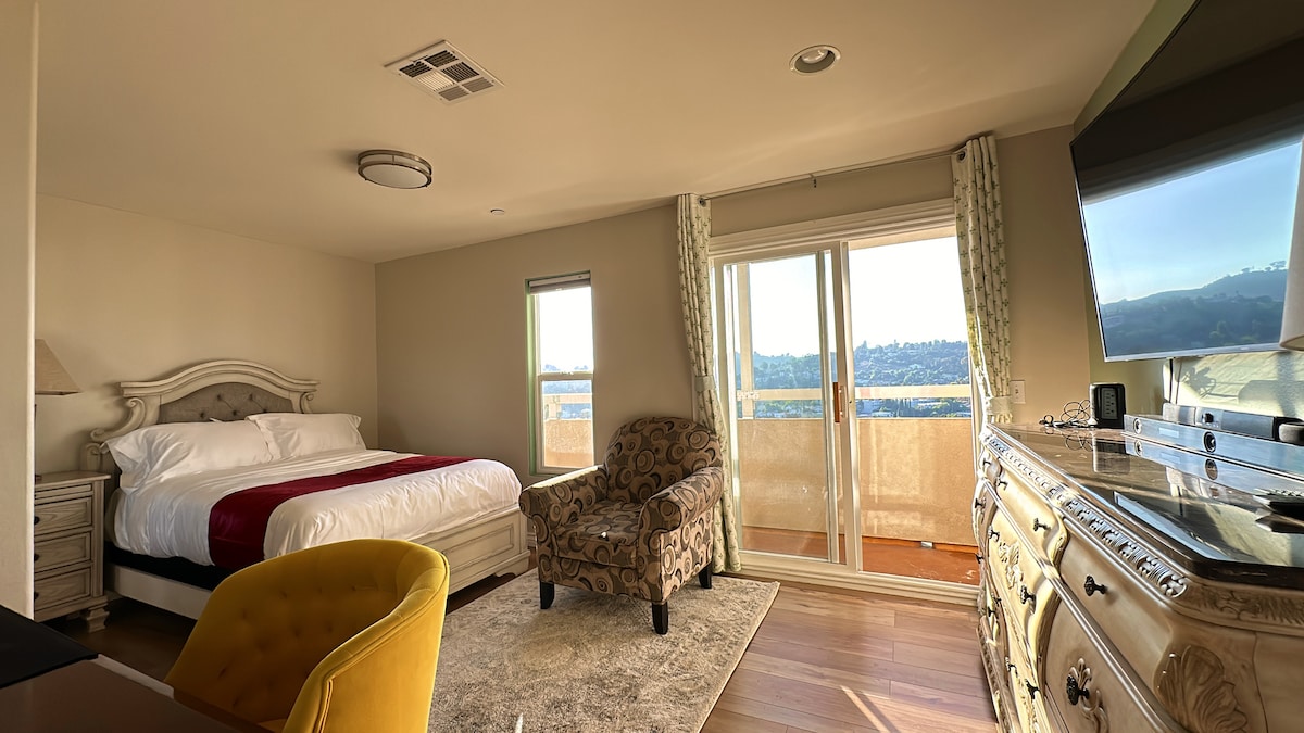Este es un estudio de cama tamaño queen de la planta baja con una base elevada de un escalón. La cocina pequeña tiene utensilios de cocina básicos y juegos de comedor. Para todos los servicios, busca la lista debajo de las fotos de la cocina pequeña. No se proporcionan condimentos. Mesa de comedor con 2 asientos Se proporcionan champú, gel de ducha, acondicionador y lavado a mano. A 2 cuadras del centro de la Alhambra, donde hay todos los restaurantes, bares, tiendas minoristas, tiendas de comestibles, cines, etc.