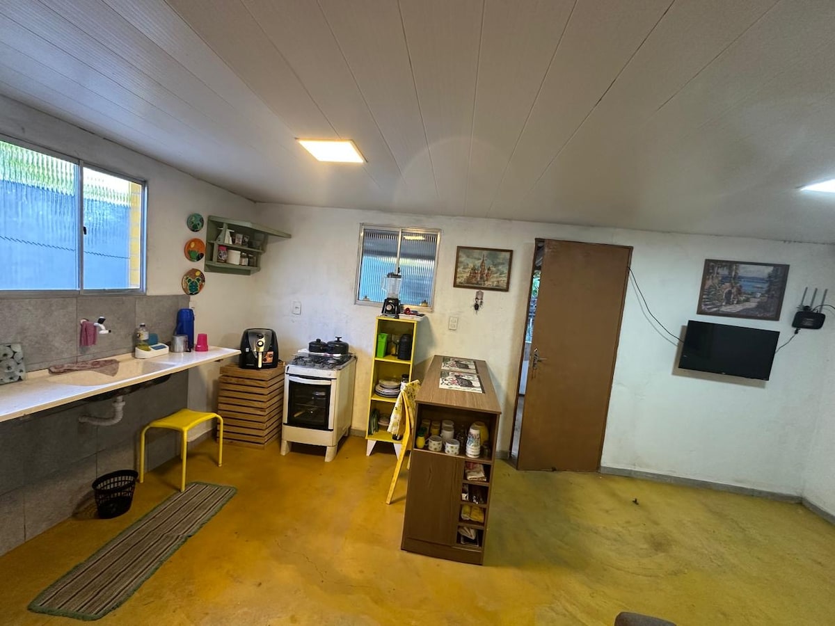 Chacara arbolada rústica c/ Piscina de fibra de 3 x 5 m 1 suite con armario de 4 m, 1 dormitorio social con armario de 5 m, escritorio de computadora para estudios o trabajo remoto, con cama doble en ambos dormitorios) con TV inteligente, 6 colchones individuales, gran sala de estar americana, con TV, sofá, estante, cocina con mesa de vidrio grande, purificador de agua, refrigerador, freidora de aire, estufa, horno eléctrico, licuadora, sandwichera, parrilla, fregadero, mesa de madera y bancos de 3 m, cinta de correr manual, escalón, bicicleta y 4 hamacas y Wi-Fi.