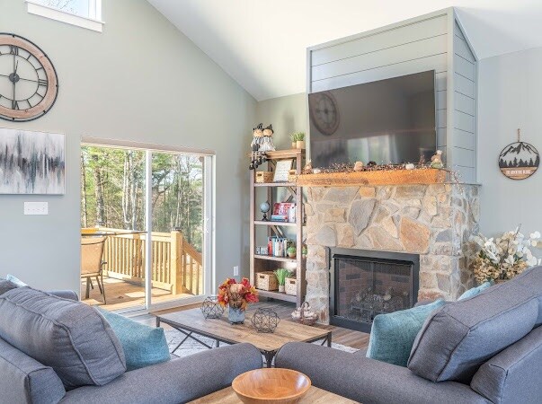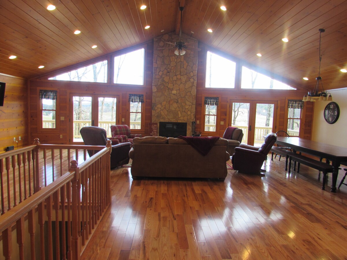 Nuestra casa es una cabaña de estilo post & beam de 2 dormitorios y 2 baños. Se encuentra en 4 acres con acceso/vistas a la montaña y vistas al río con fácil acceso. Estamos directamente en el río New con 330 pies de frente al río al final de una carretera privada con mucha distancia hasta el vecino más cercano. La sala de estar tiene una hermosa chimenea de piedra apilada con un sofá cama y 2 juegos de puertas francesas que se abren al porche delantero y al amplio porche lateral cubierto.