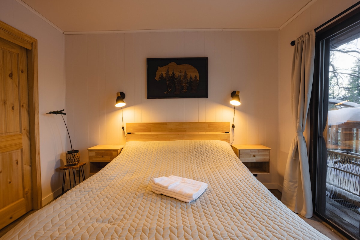 Acogedora cabaña de madera cerca de senderos, lago y estación de esquí