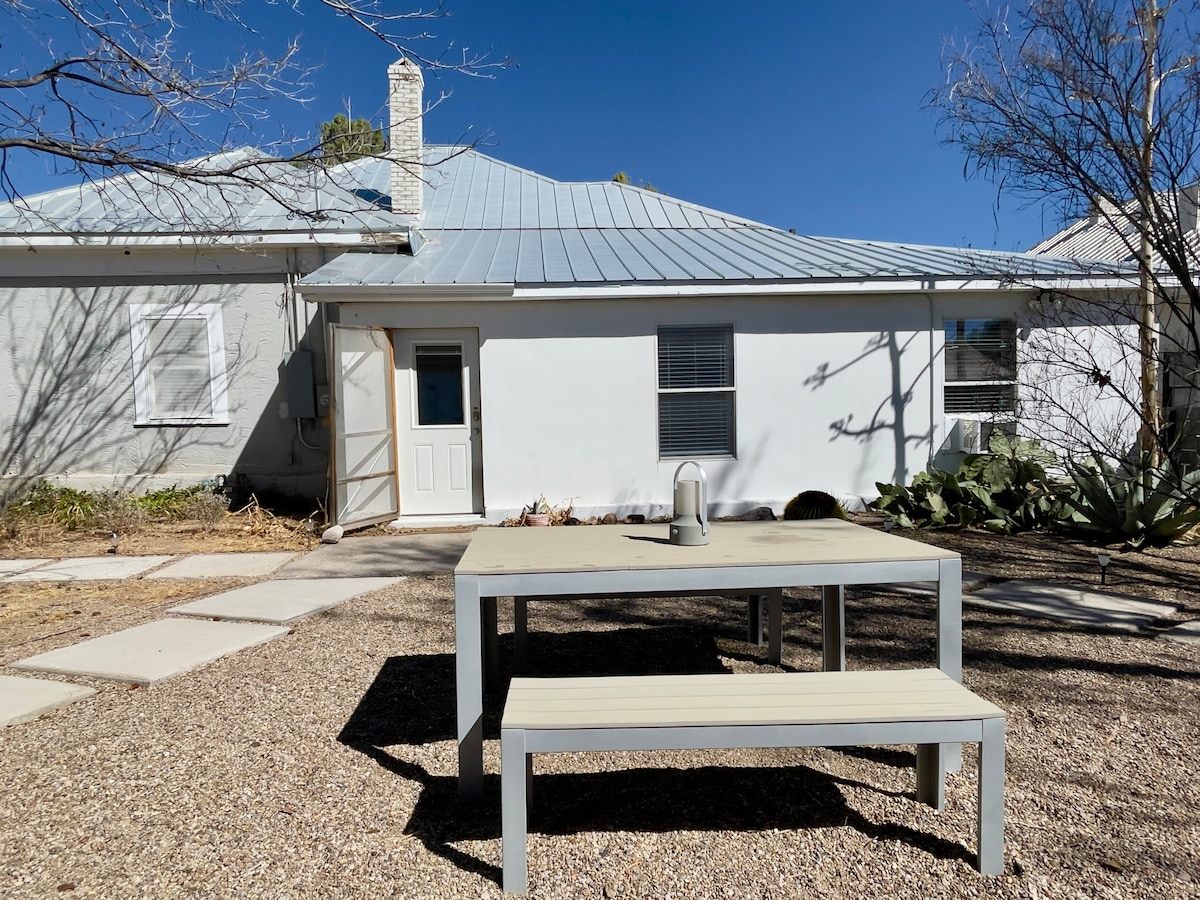 *COVID SAFE, NO SHARED INDOOR SPACE OR AIR VENTS* Centrally located, private suite, in 1920s Adobe with cozy king bed, coffee bar with mini-fridge, TV, strong Wifi, and completely private bathroom + entry way. Just blocks from the center of Marfa, you can easily walk everywhere in town or relax with drinks in the beautiful shared courtyard. **2 Night Minimum weekends ** 3 night minimum Events/Holidays** Price includes Local 7% Hotel Occupancy Tax (Marfa ID #S46)