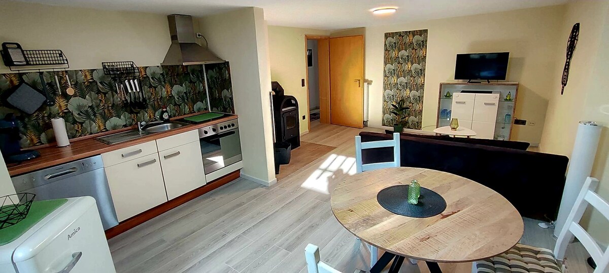 Disfrute de una agradable estancia en una zona tranquila para practicar senderismo, ciclismo, trabajar o simplemente relajarse. El apartamento tiene su propia entrada y una terraza. La cocina abierta totalmente equipada (horno, microondas, cafetera) ofrece espacio para una familia o un máximo de cuatro personas con una gran mesa de comedor y una cama adicional. La sala de estar está equipada como una habitación de paso a la ducha y al inodoro con un escritorio y otro sofá cama.
