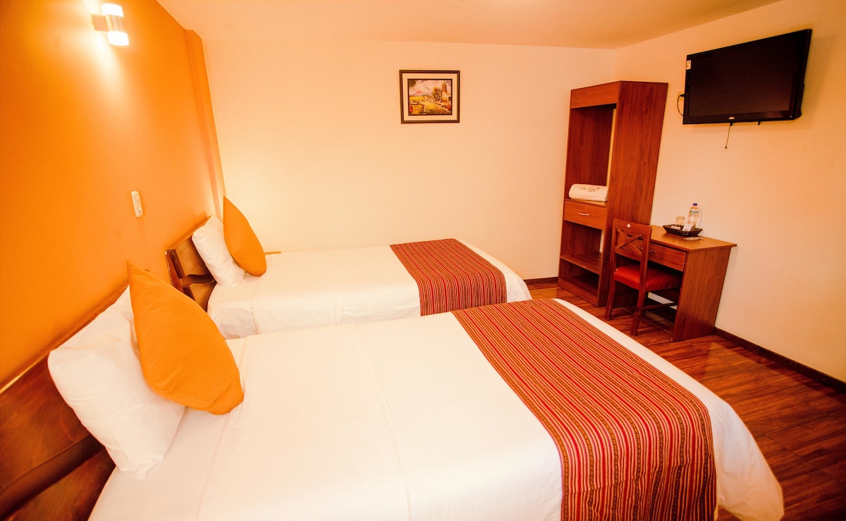 Ubicada en el primer piso de Villa Sillar, esta habitación es ideal para una familia pequeña o grupo de 3 personas. Cuenta con una cama matrimonial y una individual, baño privado con agua caliente 24/7, Smart TV con cable, Wi-Fi, escritorio y desayuno típico diario (7:00–8:30 a.m.). Las ventanas dan a patios internos tranquilos, con zonas comunes ideales para leer, relajarte o trabajar en un ambiente lleno de historia y encanto arequipeño.
