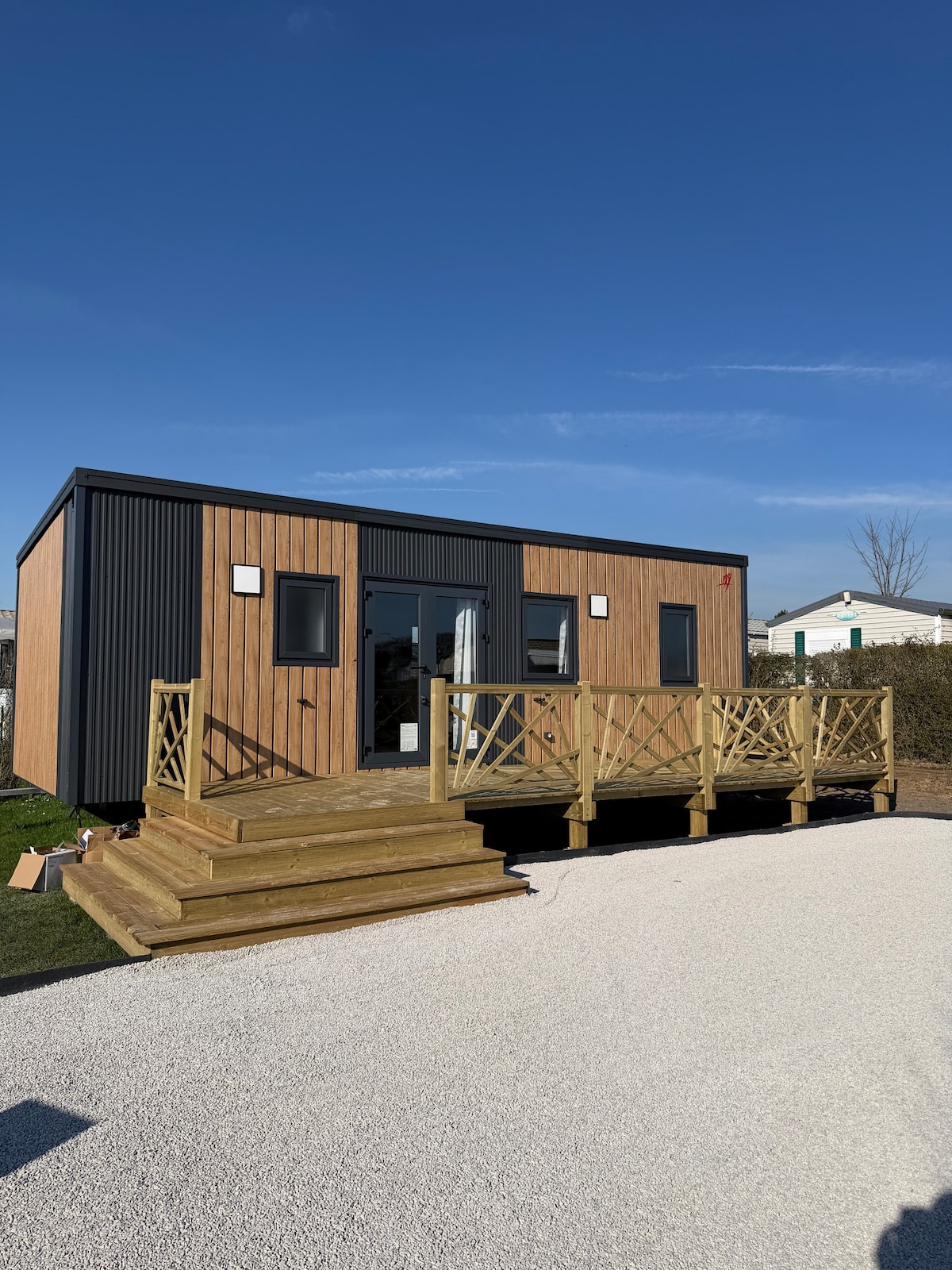 Bienvenido a nuestro pequeño nido cerca del lago de Ardres. Incluye: - 1 dormitorio con cama de matrimonio - 1 dormitorio con una litera - 1 baño (secador de pelo, plancha de pelo…) - 2 Televisiones - wifi de fibra - 1 chimenea eléctrica - Cocina equipada... - 1 gran terraza cubierta con muebles de jardín + jacuzzi privado - 1 parrilla -2 bicicletas (con suplemento) - 2 tumbonas,… Vista a un parque infantil. Lugar de estacionamiento gratis. La playa de Calais a 20 km. Pesca permitida en el lago.