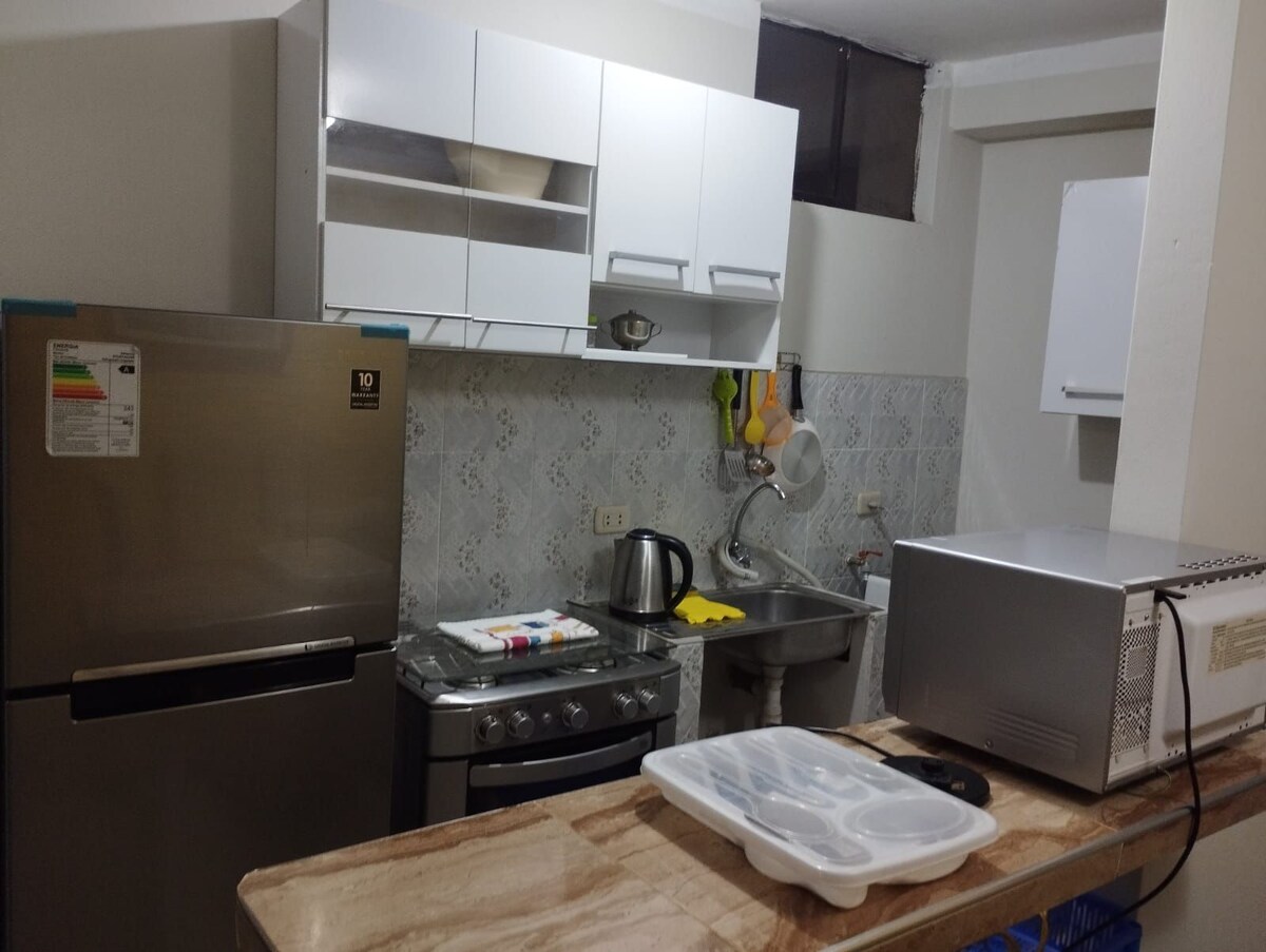 Habitación céntrica y cómoda en zona residencial segura. Ubicada en el primer nivel con ingreso directo desde la calle, lo que brinda mayor privacidad. Baño privado con ducha caliente Cama de 2 plazas cómoda TV con SuperTV: Netflix, HBO, Paramount y más (canal adultos clave 1234) Frigobar, microondas y cocina eléctrica Área de lavandería Excelente ubicación: cerca de farmacias, bodegas, panadería, cafés y fast food. Ideal para viajeros o estadías largas. Reserva y disfruta comodidad y privacidad