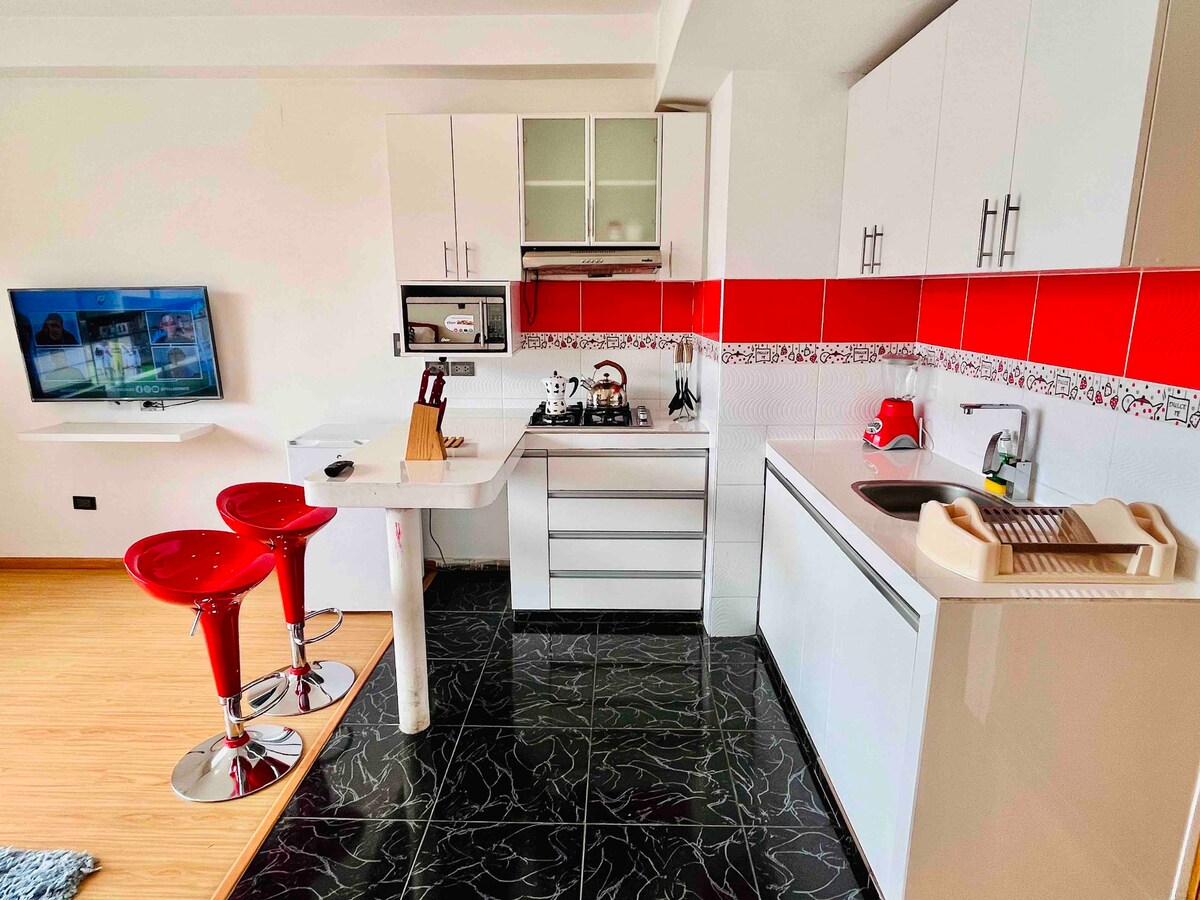 El Departamento es de estreno , esta ubicado en la residencial Rivero a 1.5 Km de la plaza de armas y el centro de la ciudad o 10 minutos caminando .Es un lugar muy tranquilo y seguro para un descanso agradable para los visitantes, cuenta con todo lo esencial para una estadía inolvidable.