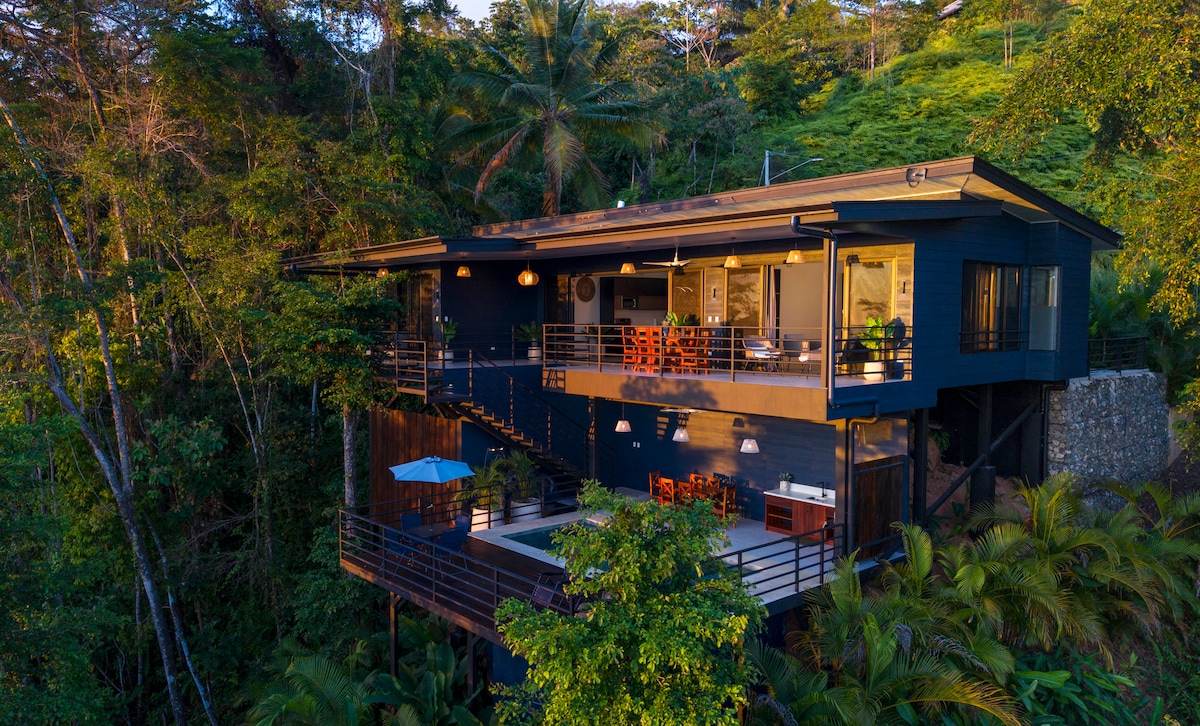 Casa en la colina con vistas al mar al atardecer, surf y selva