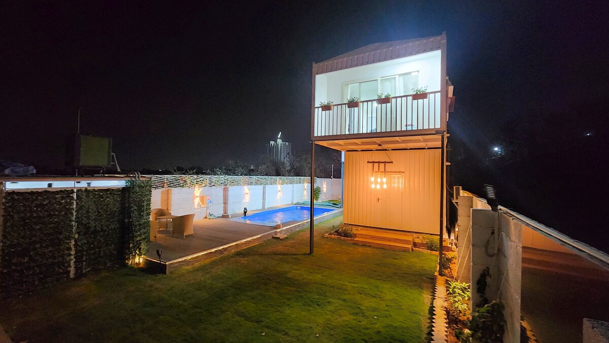 Un refugio sostenible único perfecto para cumpleaños, picnics, despedidas de soltero/soltera, cualquier celebración o simplemente un descanso de la rutina. Situado en una zona industrial privada y segura sin vecinos, ¡disfruta de tu música y risas libremente! Date un chapuzón en la piscina climatizada privada de 22 pies, relájate en el exuberante jardín, disfruta de la parrilla de uso propio y pide comida o productos básicos a través de Zomato, Swiggy, Blinkit o Instamart. Diseñado cuidadosamente para la comodidad, la diversión y los recuerdos inolvidables con tus seres queridos.