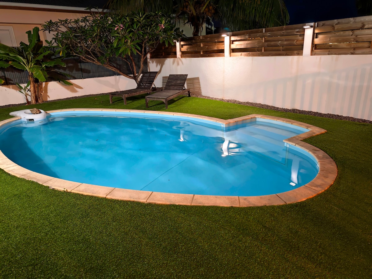 Acogedor bungalow con terraza y piscina 🌴 Encantadora casa de campo con aire acondicionado (50 m²), cama doble y sofá cama (4 personas), baño moderno y terraza amueblada con cocina equipada (microondas, cafetera, lavadora). Disfruta del acceso a la piscina compartida para una estancia relajante. 🍽️ Mesa de huéspedes disponible: desayuno 10 €, cena desde 25 €, con sabores locales. ¡Ideal para una estancia auténtica y relajante!