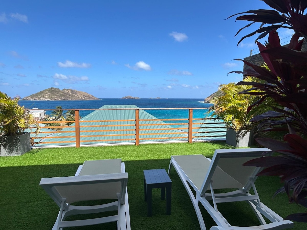Apartamento a estrenar de 1100 pies cuadrados. A 2 minutos de Gustavia y del aeropuerto. 2 habitaciones y 2 baños. Terraza de 300 pies cuadrados, vistas al mar y piscina. Por favor, consulta también Puesta de sol y vistas al mar en St Eustache 1