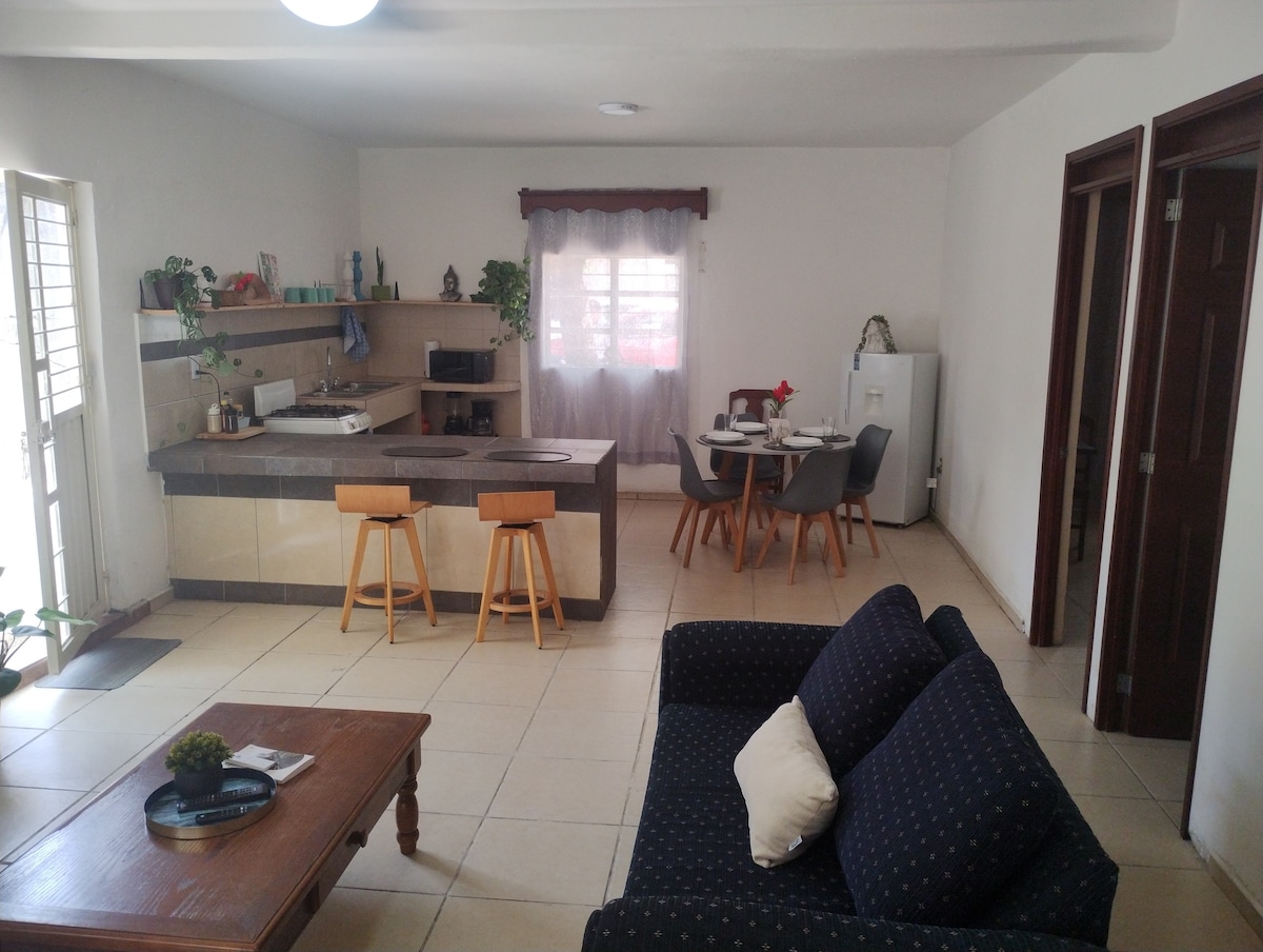 Relájate con toda la familia en este alojamiento donde la tranquilidad se respira. CAMA KING SIZE recámara con aire acondicionado Y SOFÁ CAMA MATRIMONIAL en sala con aire acondicionado portátil, una bicicleta para que vayas al pueblo está súper cerca la plaza principal, te tengo café para que te hagas un cafecito. Compartirás patio exterior y cochera amplia con Morada Shalom “ Paz y Armonía “es un loft, dentro de la propiedad, sus mascotas podría andar sueltos está todo bardeado con precaución