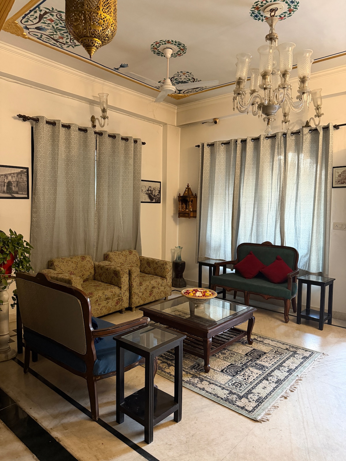 Te damos la bienvenida a The Shri Lalluji Suite, una estancia surrealista de 1 dormitorio pintada a mano donde no solo vives en un alojamiento, sino que vives dentro de un boceto. Cada pared, arco y marco está diseñado con frescos en miniatura tradicionales de Rajasthani en blanco y negro. Una escapada perfecta para parejas, amantes del diseño y viajeros lentos, esta suite combina el patrimonio real de Jaipur con una comodidad moderna e inteligente.