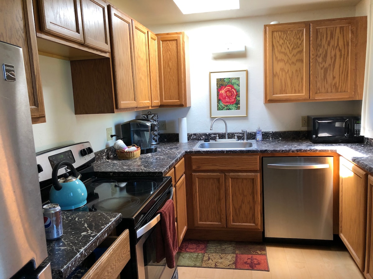 Excelente ubicación con vistas al bosque de secuoyas. Nuestro bungalow está totalmente equipado. Vuelve a casa con tu botín del mercado de agricultores y haz uso de la cocina bien surtida o de la parrilla del balcón. Ponte cómodo en la sala de estar con solo pulsar un botón con la chimenea de gas y la Smart TV. Duerme profundamente en la cama tamaño king o queen. Si tienes personas adicionales, puedo proporcionar un colchón inflable. Camina desde tu puerta hasta Cal Poly Humboldt, Arcata Plaza y Shay Park. Una maravillosa base de operaciones.