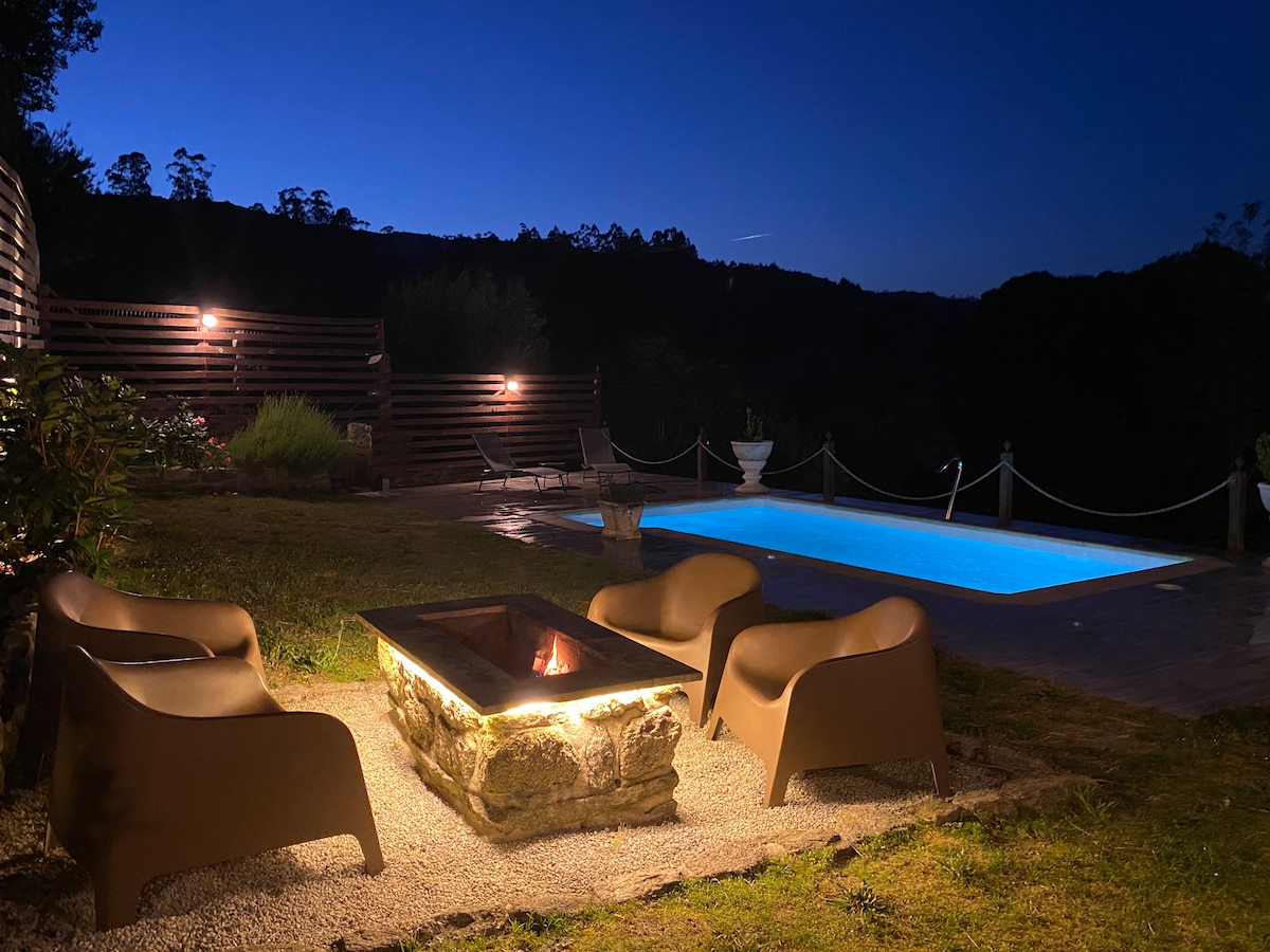 En este alojamiento se respira tranquilidad: un lugar donde escuchar el sonido de la naturaleza, desconectar del estrés de la ciudad, hacer rutas de senderismo,desayunar y comer al aire libre, bañarte en la piscina mientras preparas una buena barbacoa en pareja o con la familia, en un entorno espectacular donde poder visitar el mirador más alto de Coruña con sus impresionantes vistas,ir a la playa fluvial en el lago das Encrobas, parque acuático. Cerca del aeropuerto de Coruña y De Santiago.