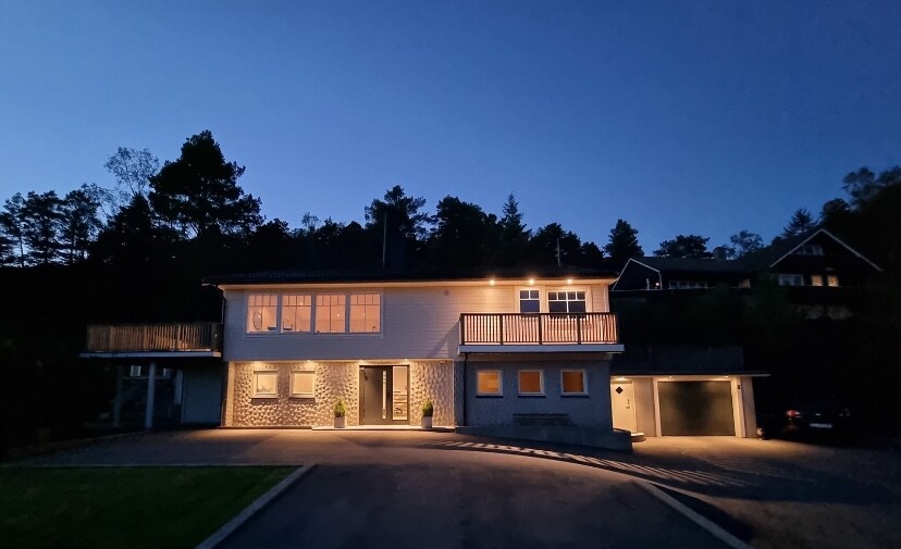 Te damos la bienvenida a nuestra vivienda privada. Juguetes, suministros de dibujo y todo lo demás que un niño puede desear, puedes usar libremente. 3 dormitorios con una cama doble. Una sala de estar tipo loft con una cama doble, así como un sofá cama con dos lugares para dormir. Una terraza con salón y una gran mesa de comedor. El sol de la mañana a la noche. Cargador de coche eléctrico, observador en el techo, calefacción por suelo radiante, bomba de calor en el 1.° piso y 2.° piso que se puede utilizar en calefacción (aire acondicionado) y días fríos. Televisión con AppleTV con suscripciones que se pueden utilizar libremente. A 3 minutos de la casa se encuentra "Træet Badeplass"