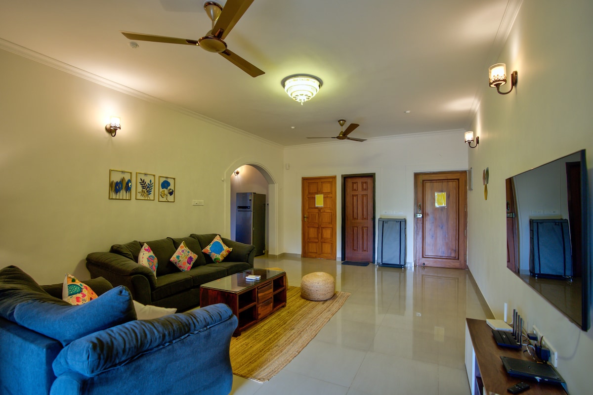 ¡Te damos la bienvenida a nuestro exuberante apartamento tipo estudio en Goa, frente a la colina del bosque protegido! Este refugio totalmente amueblado cuenta con una luminosa sala de estar con una decoración moderna, una cama acogedora y una zona de cocina totalmente equipada. Disfruta del sereno entorno o date un chapuzón en la resplandeciente piscina de la sociedad. Con impresionantes playas cercanas, puedes tomar el sol y disfrutar de actividades acuáticas. Ya sea para una escapada romántica, un retiro en solitario o WFH, ¡nuestro apartamento es la escapada perfecta para una estancia inolvidable en Goa!