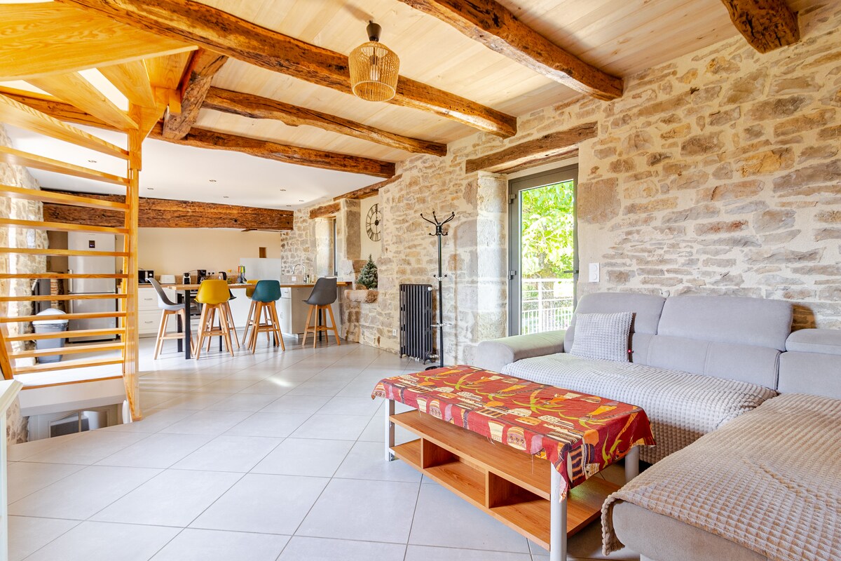 Quercynoise completamente renovada en un ambiente cálido. Ideal para 2 adultos y 2 niños mayores de 7 años (entrepiso) o 2 adultos. Disfrute del jardín privado y relájese en el jacuzzi solo para usted. Ideal para una estadía relajante en familia o con amigos, cerca de la naturaleza. Animales en la propiedad (ovejas, burros, gallinas, perro). ¡Comodidad, tranquilidad y convivencia en la cita! Posibilidad de excursiones desde la casa, lago de pesca accesible a pie.