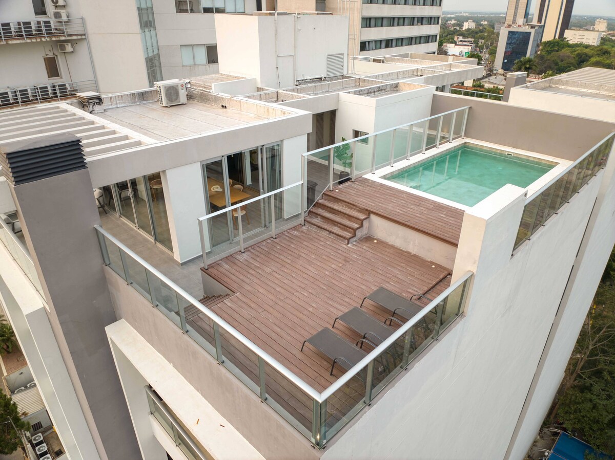 VIVE ASUNCIÓN DESDE LO ALTO: estilo, confort y vistas únicas en un moderno departamento con doble acristalamiento, Aire acondicionado, Smart TVs y anti-mosquitos en cada una de las estancias. Cocina equipada, lavadora-secadora y armarios amplios. Terraza privada con quincho. Disfruta de la impactante piscina panorámica, sala de cine y más amenities de primer nivel. Ubicación en la zona más segura y vibrante de Asunción. Ideal para viajeros exigentes. ¡Tu experiencia en Asunción empieza aquí!