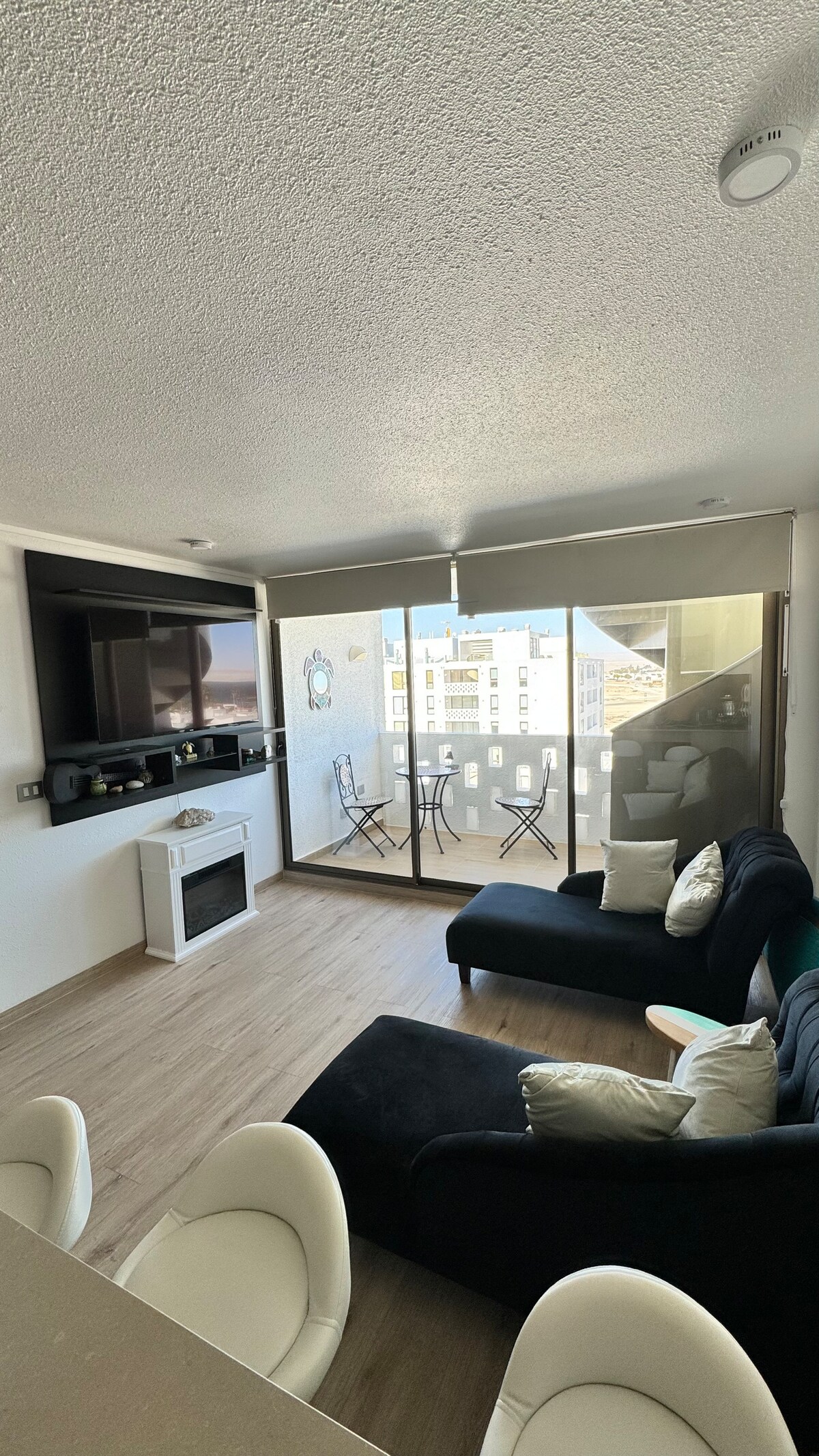 Departamento familiar, relajante y confortable, incluso cuenta con calefactor con efecto chimenea y ventilador. Sofá cama en living y hab. Cuarto piso vista al mar por ambos lados del balcón. En caso de requerir auto en arriendo también existe disponibilidad. A minutos del aeropuerto. Tiene wifi para 30 equipos. Esta pensado en que los días sean espectaculares y que no te falte nada para tus vacaciones. A pasos de playa blanca. Áreas verdes piscina y quinchos, además de juegos para los niños.