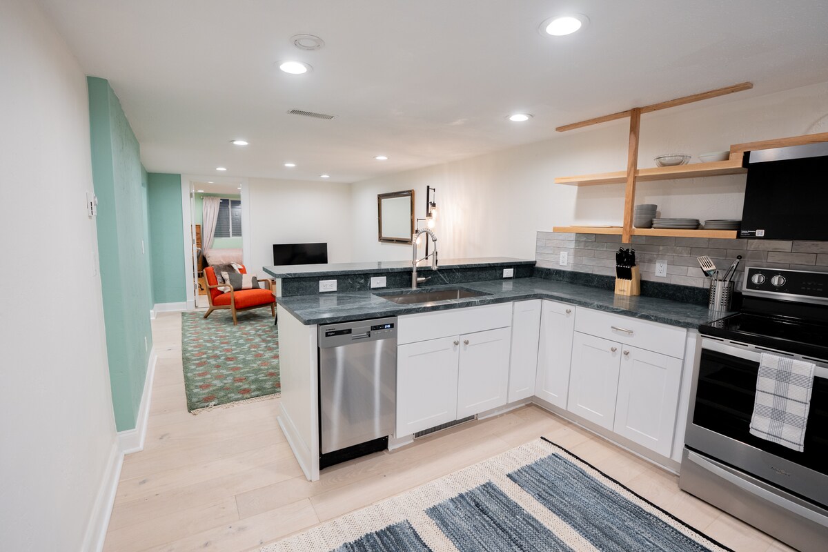 El apartamento estudio está en un edificio de bloques de cemento que en un momento fue una tienda de mecánica automotriz. Está a una cuadra de Main Street. Muy cerca de Catholic College, NOL y todos los restaurantes y bares del centro de la ciudad. Hay una habitación con una cama tamaño queen de felpa, sofá (con cama escondite), televisión con acceso a Internet, Wi-Fi para el uso de los huéspedes. La cocina está separada por una barra de desayuno y taburetes de bar. Hay un vestidor y un baño con ducha fuera de la habitación grande.