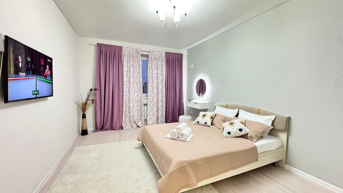 Un acogedor apartamento en el microdistrito. Nursaya, complejo residencial Maltiyskiy Dvorik. El aeropuerto está a 5 minutos en auto, las tiendas de comestibles y el supermercado están a pocos pasos. El apartamento cuenta con todo lo necesario para una estancia cómoda.