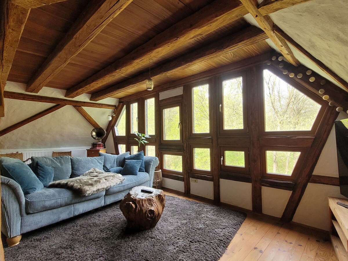 El apartamento tipo estudio abierto en la casa de la puerta forma parte de una gran finca del siglo XVII. Antiguos maderos y entramados a la vista están rodeados de rosales y un hermoso jardín. A la hora de amueblar, hemos dado gran importancia a la sostenibilidad. Se ha reconstruido y remodelado lo que ya existía. La mayoría de las luces, los textiles y los cuadros proceden de nuestro estudio. Esto le da a la arquitectura abierta su estilo especial, así como su carácter agradable y único.