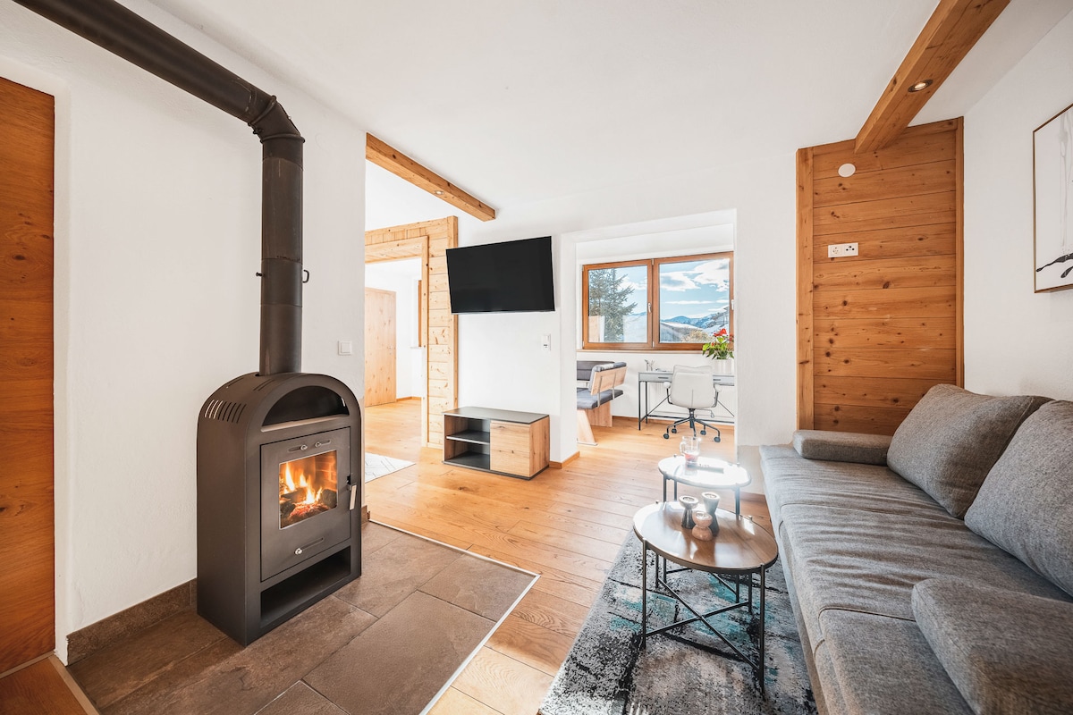En la categoría Junior Suite con vistas a la montaña, le espera un apartamento de más de 30 m² para un máximo de tres personas con cama doble king size y un sofá cama individual de alta calidad. El apartamento dispone de una cocina totalmente equipada con una acogedora sala de estar, un lujoso baño con una ducha extragrande y una secadora, así como una terraza de 10 m² con suficientes asientos para disfrutar de un delicioso desayuno al aire libre con unas vistas maravillosas de las montañas tirolesas.