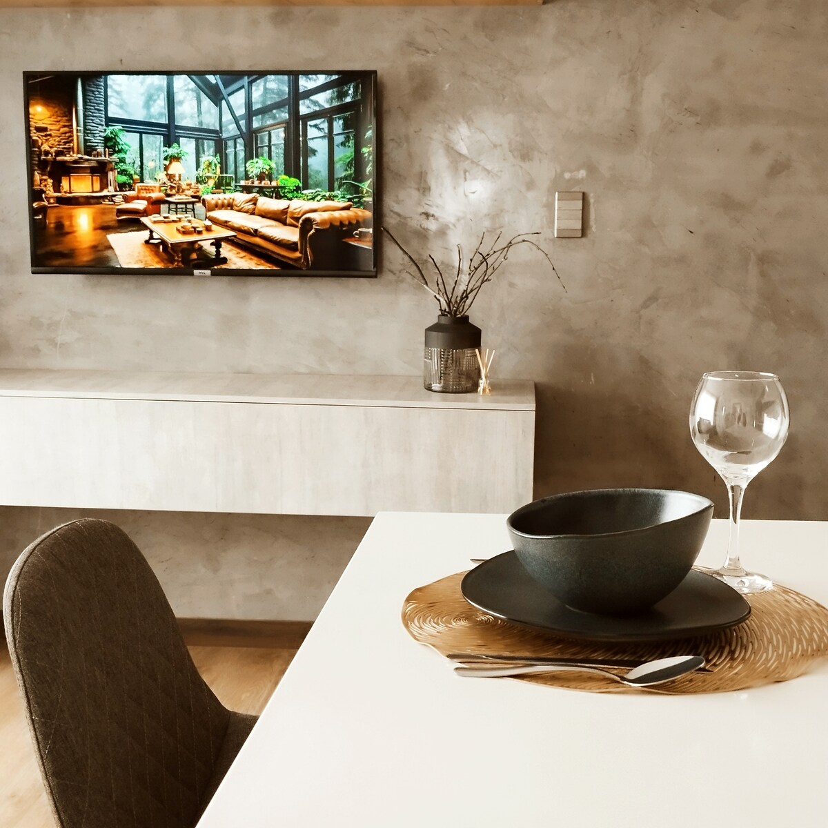 Este elegante alojamiento es ideal para noches de pareja, familia corta o estadías largas de trabajo. Contamos con jacuzzi dentro del departamento, chimenea de bioetanol y una sala con una pantalla de 85” para las mejores noches y experiencias inolvidables de sus vacaciones. Cama tamaño king y hermosos balcones. Cocina propia con todos los implementos necesarios. Cerca de lavanderías, tiendas, restaurantes. Parqueadero propio y cámaras con vista a la calle para su tranquilidad.
