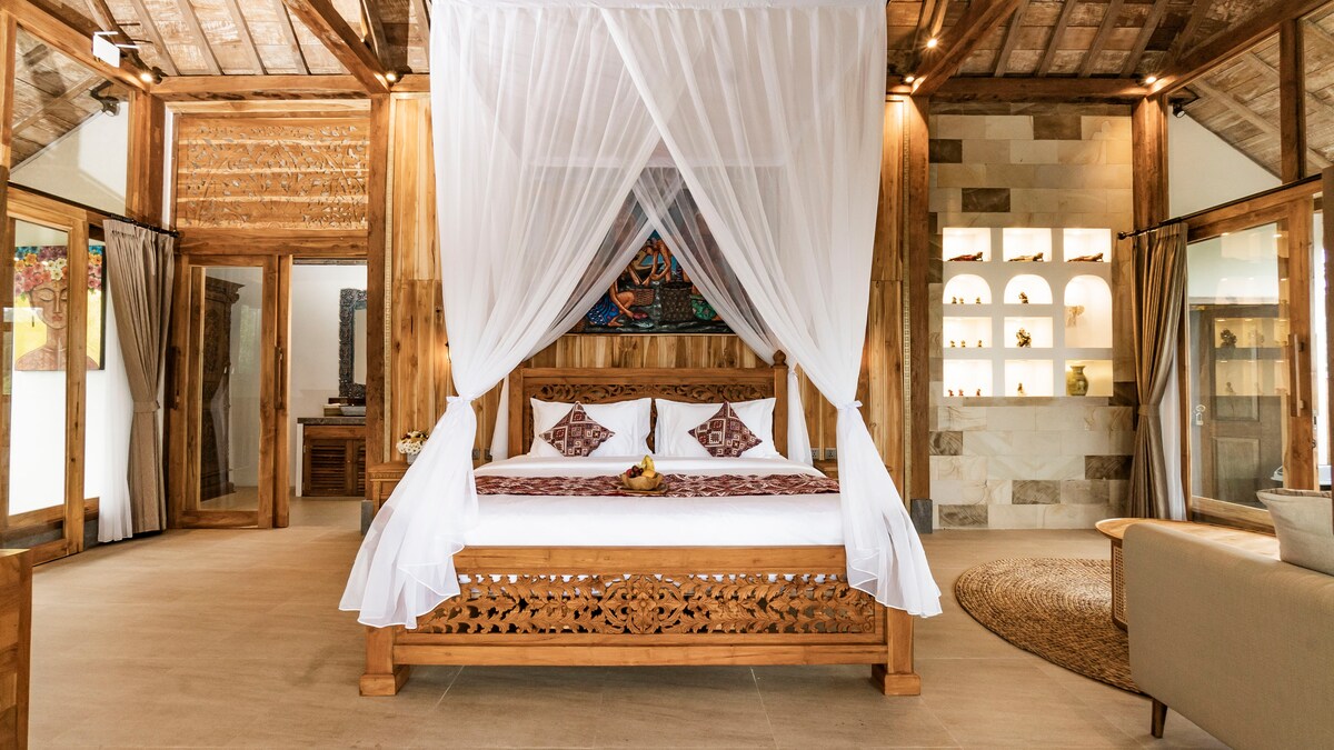 Agave es romántico: teca de 100 años, un techo de paja tejido a mano y una piscina de piedra blanca. Apartado (40 pasos), pero cerca de cafeterías, yoga, mercado y paseos. Ideal para parejas y familias pequeñas. Los dormitorios tienen aire acondicionado y cerradura; la sala de estar permanece abierta al exterior. No se puede acceder en automóvil; se deja a los huéspedes en Bintang y luego hay que caminar 5 minutos. Nuestro equipo te recibirá y llevará las maletas; te recomendamos que utilices nuestros conductores. Opera de acuerdo con la normativa local. Impuestos incluidos; es necesario registrar al huésped.
