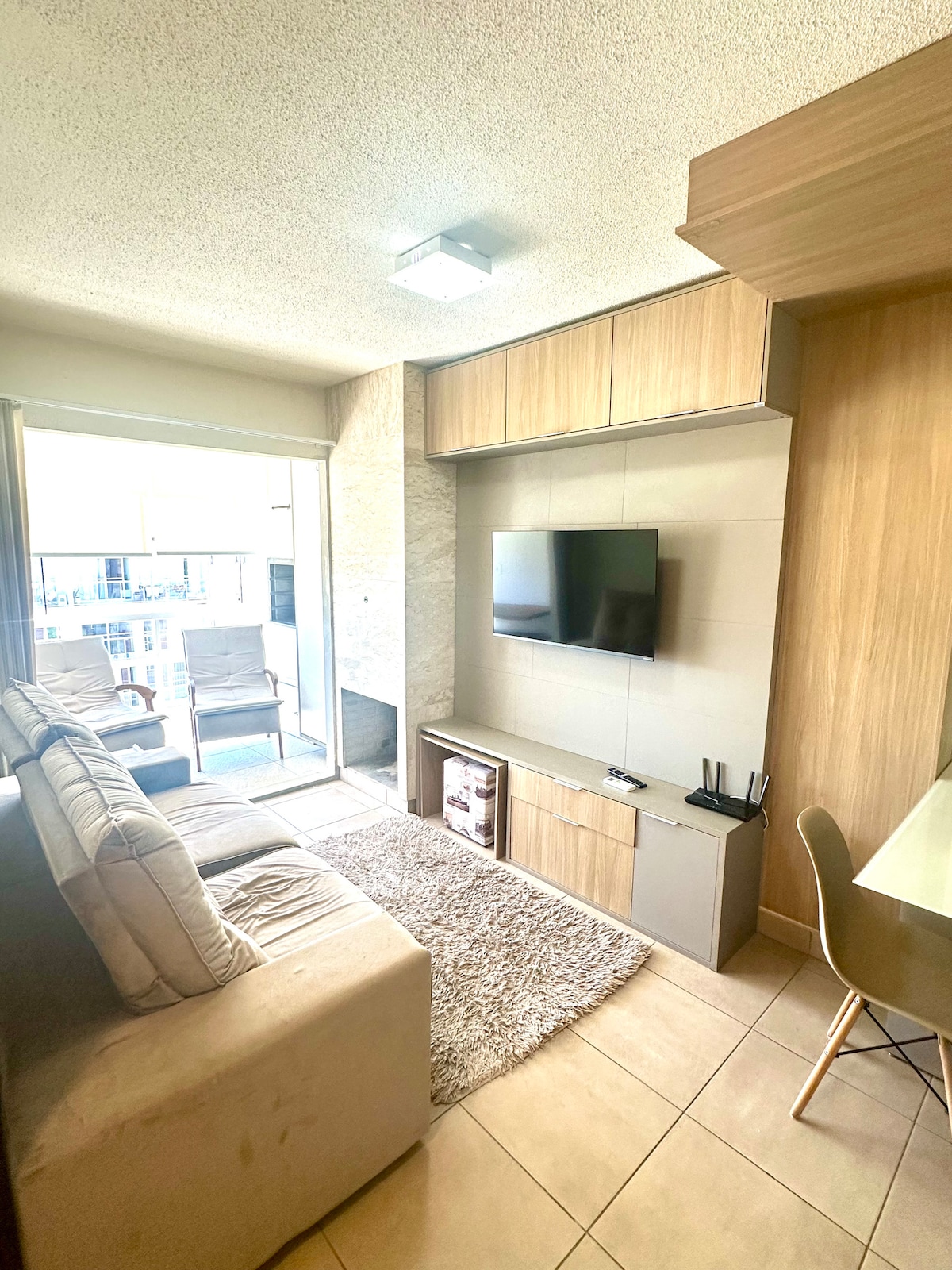 Lindo apartamento completo no 8º andar, de frente, em localização central. Totalmente mobiliado, com cozinha completa, máquina lava e seca, lareira, churrasqueira, Smart TV e Wi-Fi. São 2 quartos: suíte com ar-condicionado e quarto com cama de solteiro e espaço para Home Office, ventilador e grade infantil. Sala com ar-condicionado. Condomínio com pracinha e área pet. Inclui roupas de cama, toalhas e 1 vaga de garagem.
