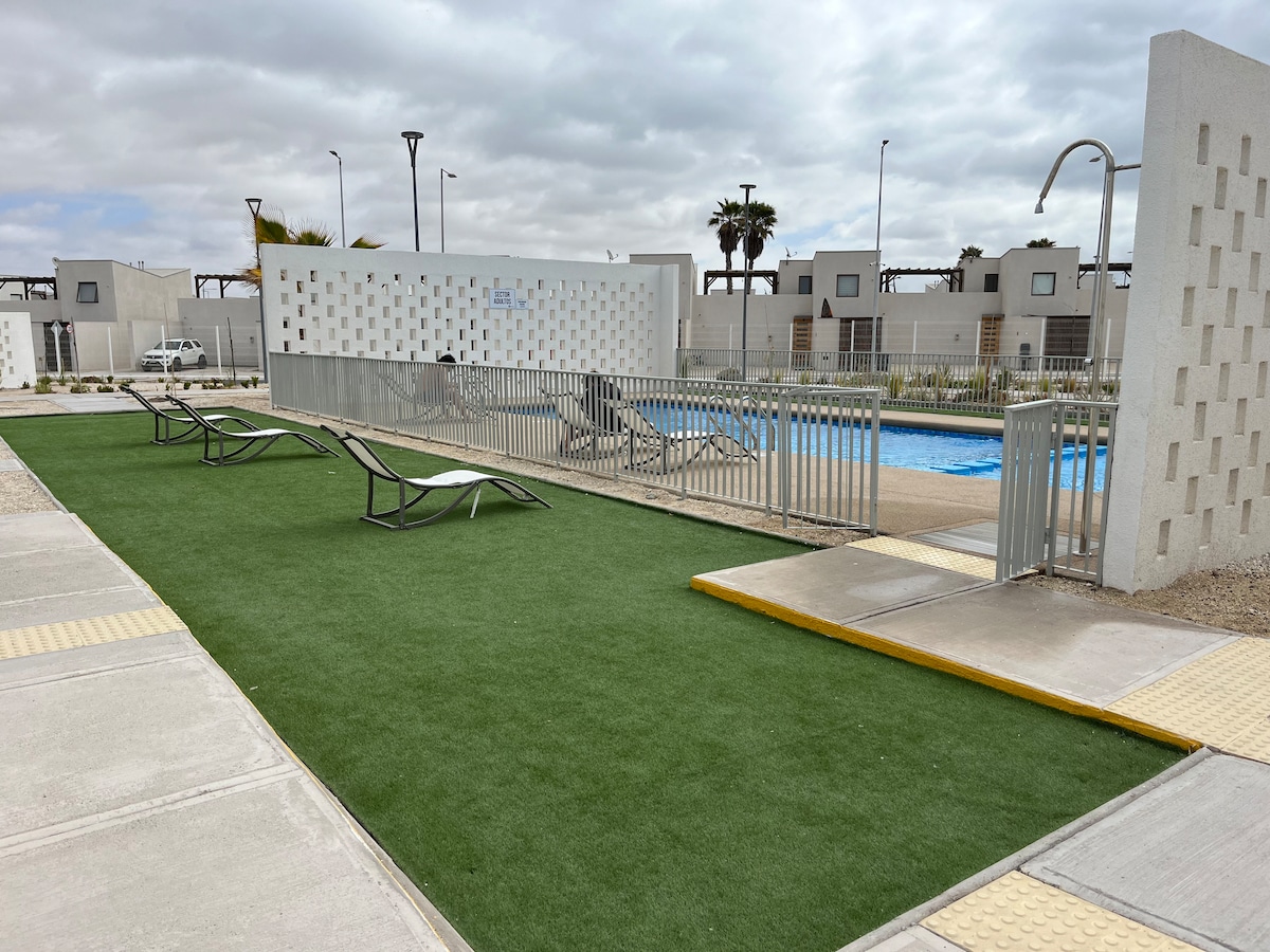 La casa se encuentra a una cuadra de la playa principal y del centro de Bahía Inglesa. Forma parte de un condominio muy tranquilo, el cual cuenta con piscina, juegos para niños y áreas comunes para compartir y disfrutar. Tiene una terraza para almorzar o cenar al aire libre. También cuenta con una barbacoa para asados y encuentros con amigos y familiares. Alojamiento Ideal para familias, parejas y amigos que quieran disfrutar de la encanto de Bahía Inglesa.