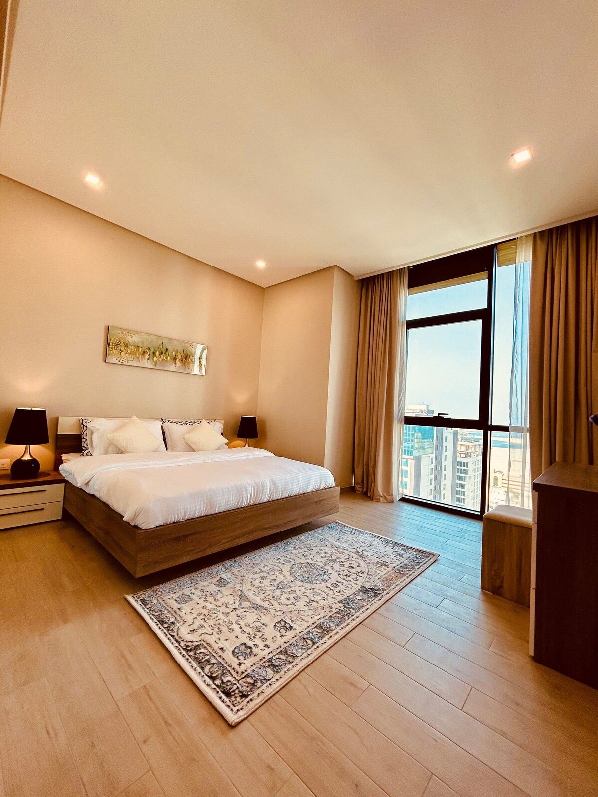 Descubre la escapada perfecta en este impresionante dormitorio amueblado en el piso 35 que cuenta con elegancia moderna, una cocina totalmente equipada y vistas impresionantes desde tus balcones privados. Disfruta de servicios como cine, gimnasios separados (hombres/mujeres), sauna, sala de vapor, piscina/jacuzzi compartidos, pista de jogging y zona de barbacoa. Aunque las tiendas y los restaurantes están a solo cinco minutos en coche, la zona es muy tranquila. Ofrecemos comodidad y estilo para una estancia inolvidable durante tu visita a Baréin.