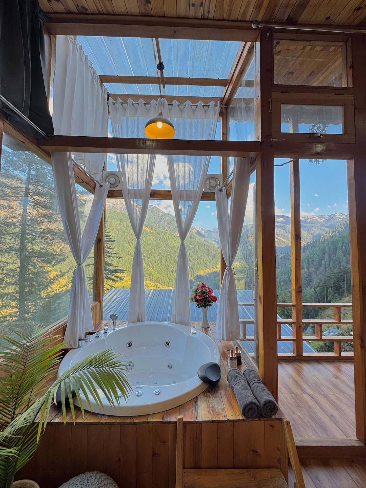Este impresionante invernadero en Airbnb en Jibhi ofrece una escapada inigualable. Ubicado en medio de imponentes árboles deodara y con vistas panorámicas de los picos del Himalaya, es tu refugio tranquilo perfecto. Disfruta de un aislamiento tranquilo del ajetreo de la ciudad, pero benefíciate de la excelente conectividad de la carretera principal y del entorno de este romántico lugar en la naturaleza.